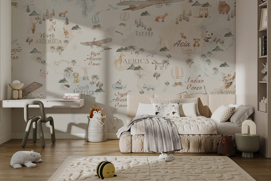 Imaginați-vă că transformați camera copilului dvs. într-o aventură de vis! Această hartă murală “Vintage Map with Animals & Aircrafts” este magie pură și cu siguranță nu este doar pentru copii. Are acel farmec minunat al lumii vechi amestecat cu atingeri capricioase – baloane cu aer cald, animale fermecătoare și avioane de epocă. Te vei pierde și tu în ea!