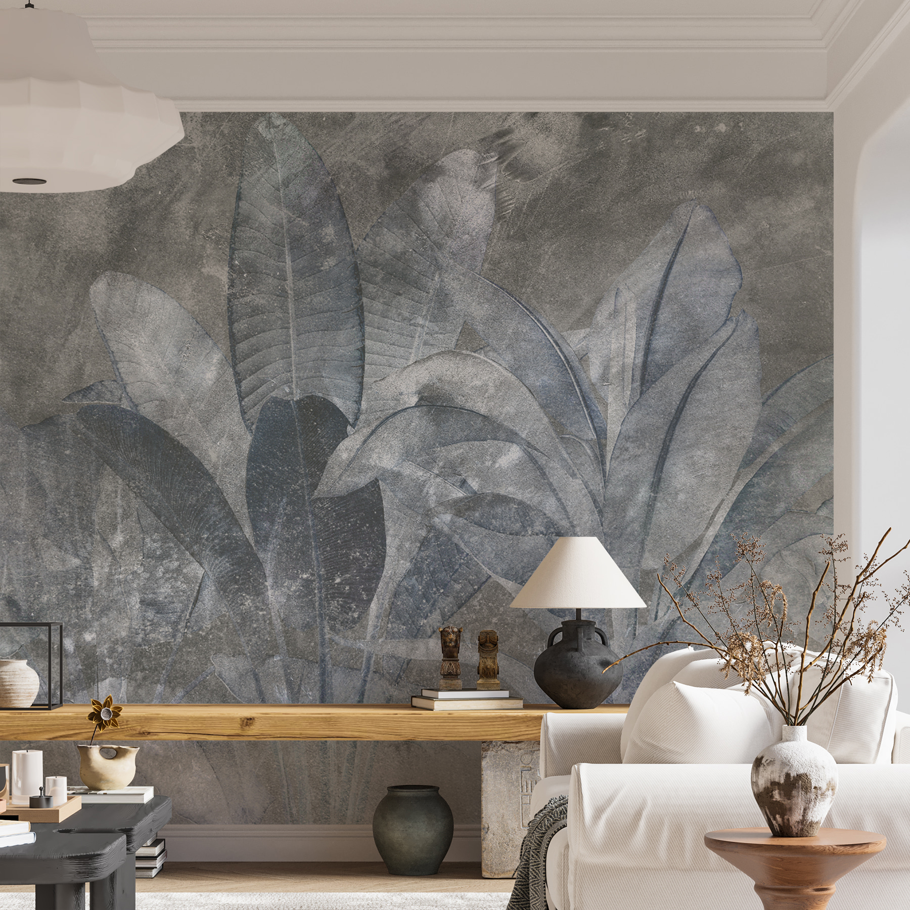Imaginați-vă că intrați într-o cameră și sunteți întâmpinați de vibrația liniștitoare a acestui mural monocrom cu textură de frunze. Este ca și cum cineva a făcut un instantaneu al unei dimineți liniștite și cețoase și l-a împrăștiat pe peretele tău. Fundalul moale, asemănător betonului, cu nuanțe de piatră, face ca detaliile frunzelor să iasă în evidență – elegant discret, dar atrăgător. Perfect pentru oricine iubește un pic de natură în spațiul său, dar nu este în culori strălucitoare, puternice. Are un aer senin, zen, perfect pentru o cameră de zi liniștită sau un birou la modă. Aproape că ai putea jura că simți miros de ploaie proaspătă când te uiți la ea. În plus, cu siguranță va stârni discuții. Superbă și subtil uimitoare, un adevărat clasic modern.