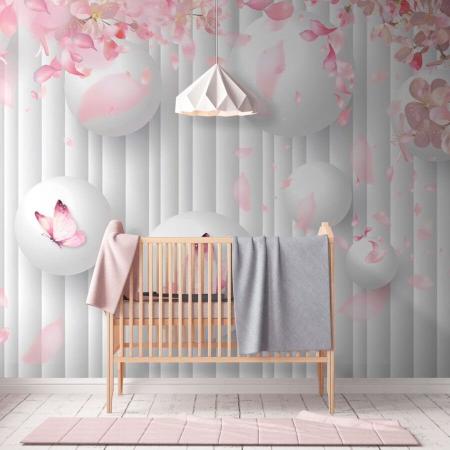 Transformați acel perete simplu într-o operă de artă cu acest mural încântător, care prezintă un dans capricios de sfere albe împodobite cu fluturi roz fermecători. Imaginați-vă că savurați cafeaua de dimineață într-un spațiu care seamănă cu o grădină japoneză liniștită, fiecare privire aruncată spre perete oferindu-vă un strop de bucurie. Petalele moi care flutură în jur evocă senzația plăcută a primăverii, aducând o atmosferă caldă și veselă. Este ca și cum ai avea natura în interior, fără alergia la polen! Perfect pentru orice cameră care are nevoie de un strop de calm și creativitate – fii pregătit pentru complimente! Acest mural nu este doar decor; este un stimulent pentru starea de spirit.
