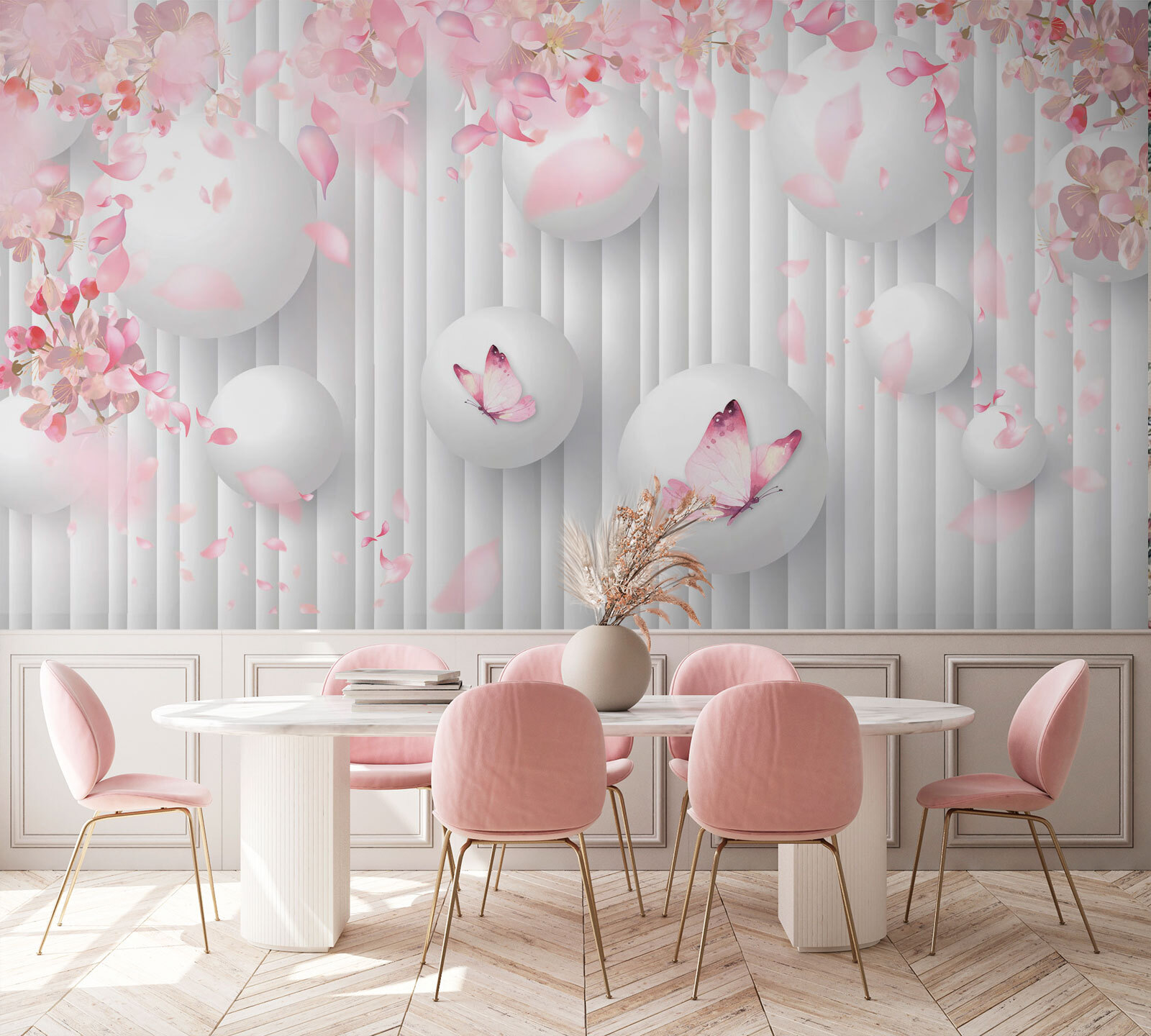 Transformați acel perete simplu într-o operă de artă cu acest mural încântător, care prezintă un dans capricios de sfere albe împodobite cu fluturi roz fermecători. Imaginați-vă că savurați cafeaua de dimineață într-un spațiu care seamănă cu o grădină japoneză liniștită, fiecare privire aruncată spre perete oferindu-vă un strop de bucurie. Petalele moi care flutură în jur evocă senzația plăcută a primăverii, aducând o atmosferă caldă și veselă. Este ca și cum ai avea natura în interior, fără alergia la polen! Perfect pentru orice cameră care are nevoie de un strop de calm și creativitate – fii pregătit pentru complimente! Acest mural nu este doar decor; este un stimulent pentru starea de spirit.