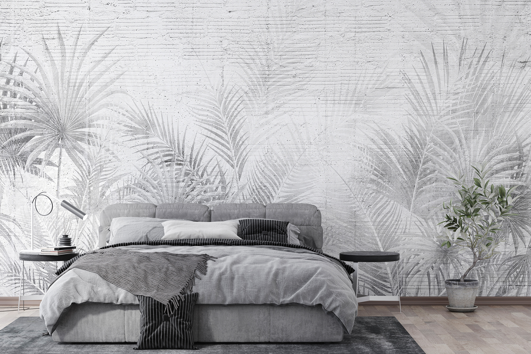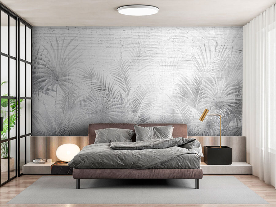 Vă gândiți să vă modernizați spațiul? Aruncați o privire la acest “tapet gri și alb cu frunze de palmier”. Are un aer cool, relaxat, care este, într-un fel, foarte șic. Amestecul de gri și alb este foarte versatil, așa că se potrivește de minune cu aproape orice aveți deja. În plus, acele frunze delicate de palmier? Adaugă atingerea potrivită de atmosferă tropicală, fără a fi prea ostentative. Imaginează-ți că intri în camera ta și te simți de parcă ai pășit într-o oază senină, la modă. Ideală pentru camere de zi, dormitoare sau chiar pentru un birou elegant, această pictură murală va face ca orice perete să strălucească. Este ca și cum ai da peretelui tău o gură de aer proaspăt. Credeți-mă, o să vă placă.