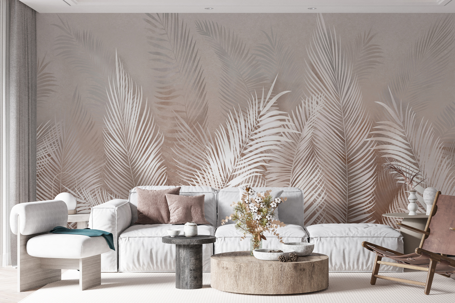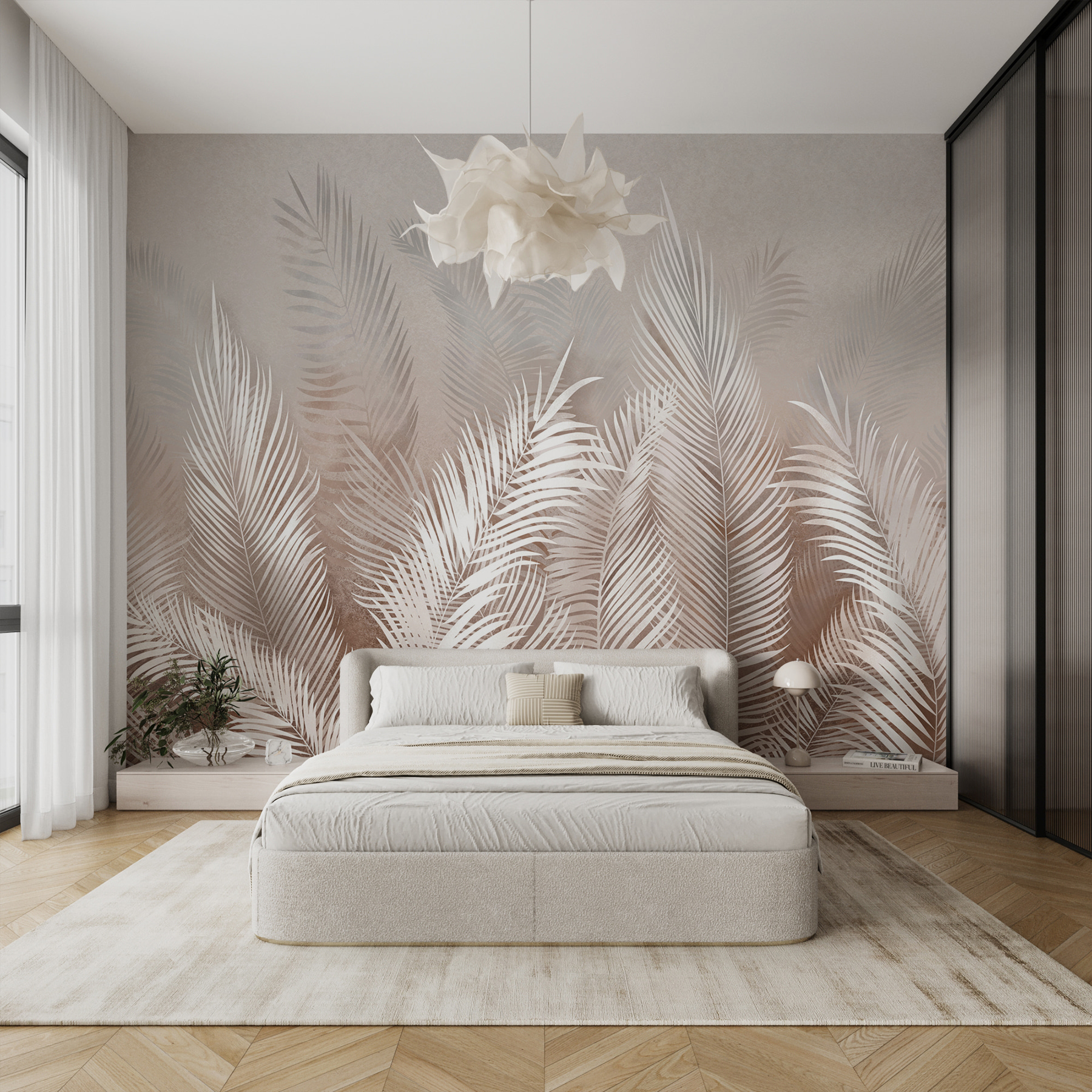 Transformați-vă spațiul într-o oază de seninătate cu această pictură murală captivantă cu frunze elegante de palmier pe un fundal moale, de vis. Imaginați-vă că intrați în cameră și simțiți briza blândă – bine, poate nu la propriu, dar vibrația este cu siguranță acolo. Culorile discrete se îmbină fără efort cu orice stil de decor, fiind perfectă pentru un refugiu liniștitor într-un dormitor sau pentru o atingere elegantă într-o zonă de living. Prietenii vor crede că aveți un talent pentru design sau poate chiar un prieten designer secret. Și cine nu și-ar dori o atmosferă tropicală în interior? Frunzele par să se legene ușor, invitând la un sentiment de pace. Fie că sorbiți cafeaua de dimineață sau vă relaxați după o zi lungă, această pictură murală vă șoptește liniștit: “Relaxează-te, ești în paradis”. Este ca și cum ai avea o mică felie de natură chiar pe peretele tău.