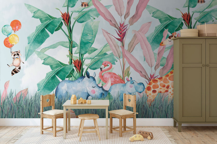 Transformați camera oricărui copil într-o aventură capricioasă cu această pictură murală încântătoare care prezintă un raton elegant cu papion, plutind printre baloane jucăușe. Imaginați-vă bucuria de pe fețele micuților pe măsură ce se scufundă într-o lume vibrantă de animale – girafe, zebre și chiar un hipopotam relaxat. Vegetația luxuriantă și culorile pastelate invită la creativitate și stimulează imaginația. Nu este doar un decor; este o mică invitație la vise mari. Imaginați-vă o oră de povești sub această pictură murală fermecătoare – este ceva magic în a fi înconjurat de asemenea tovarăși veseli. Perfectă pentru grădinițe sau camere de joacă, această pictură murală aduce căldură și distracție în orice spațiu, încurajând mințile curioase să exploreze. Pereții dvs. nu vor mai fi niciodată plictisitori, și cine știe? Poate că ratonul chiar va stârni conversații despre aventurile animalelor!