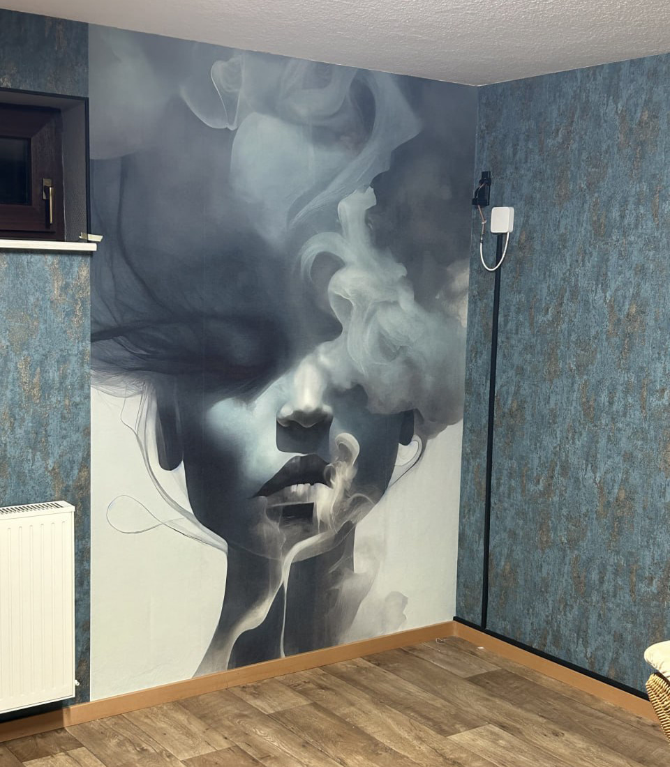 Transformați-vă spațiul cu această pictură murală uimitoare care prezintă chipul unei femei învăluit în fum eteric. Imaginați-vă că intrați într-o cameră și că această piesă vă atrage înăuntru, vibrația sa misterioasă adăugând un aer de intrigă și liniște. Amestecul delicat de nuanțe creează o prezență liniștitoare, făcând-o perfectă pentru un colț de lectură confortabil sau o evadare răcoritoare din agitația cotidiană.