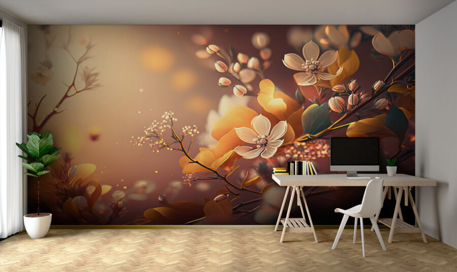 Imaginați-vă că pășiți într-o cameră în care pereții înfloresc cu flori delicate, în culori calde. Această pictură murală “Delicate Blossoms” transformă orice spațiu într-un paradis floral strălucitor. Perfect pentru acele zile gri de iarnă în care o atingere de primăvară se simte ca o îmbrățișare caldă de la un prieten. Nuanțele blânde de galben, portocaliu și verde subtil dansează pe peretele mural, adăugând profunzime și un ușor sentiment de mișcare. Este ca și cum ai avea o grădină care nu se ofilește niciodată, chiar în camera ta de zi. Imaginați-vă un colț de lectură confortabil sau chiar un dormitor – fiecare privire la aceste flori este o dulce amintire a frumuseții naturii. În plus, este ceva atât de primitor și liniștitor în legătură cu acest lucru. Această pictură murală nu decorează doar un perete, ci aduce un sentiment de seninătate și bucurie în casa ta. O doză zilnică de încântare florală fără a fi nevoie să uda! 🌸