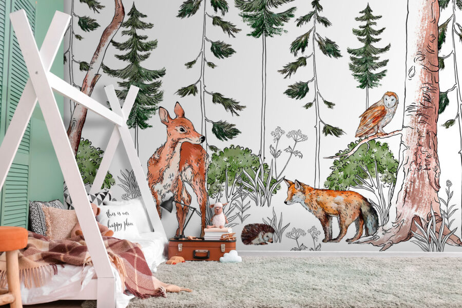 Transformați orice spațiu cu acest fermecător fototapet cu o distribuție încântătoare de creaturi din pădure! Imaginați-vă o scenă liniștită din pădure, unde un cerb curios și o vulpe jucăușă se plimbă printre vegetația luxuriantă. O bufniță privește de sus, adăugând o notă de fantezie. Este ca și cum ai avea o bucată de natură chiar pe peretele tău. Perfect pentru un colț confortabil de lectură sau pentru camera unui copil, acest fototapet invită natura în interior, transformând fiecare privire într-o mică aventură. Răspândește bucurie și căldură și lasă povestea să se desfășoare în propria ta pădure fermecată – nu te vei plictisi niciodată cu acești prieteni blănoși!