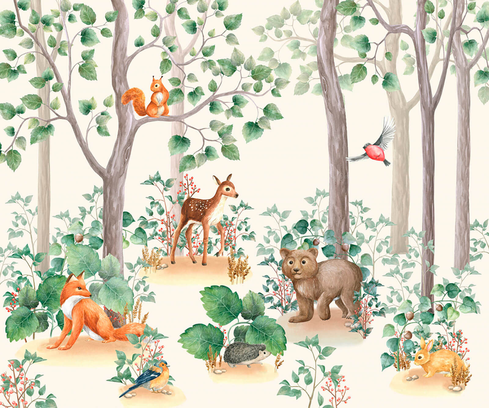 Pășește într-o pădure fermecătoare fără să ieși din casă! Acest tapet încântător, cu animale fermecătoare precum o veveriță jucăușă și un cerb curios, aduce o bucățică de natură direct în spațiul tău. Imaginează-ți că savurezi cafeaua de dimineață în timp ce privești o vulpe micuță care se uită pe furiș sau te pierzi în gânduri în timp ce un urs se plimbă pe lângă tine. Este ca și cum ai participa la o petrecere cu ceai în natură, dar fără a fi nevoie să faci curățenie după aceea. Nuantele delicate de verde și tonurile pământii creează o atmosferă caldă și primitoare, perfectă pentru a te relaxa cu o carte bună. Fie că este vorba de camera copiilor sau de sufragerie, acest fototapet aduce bucurie. Îți șoptește povești despre natură, invitându-te să te relaxezi. Cine nu și-ar dori puțină magie a pădurii în viața sa?