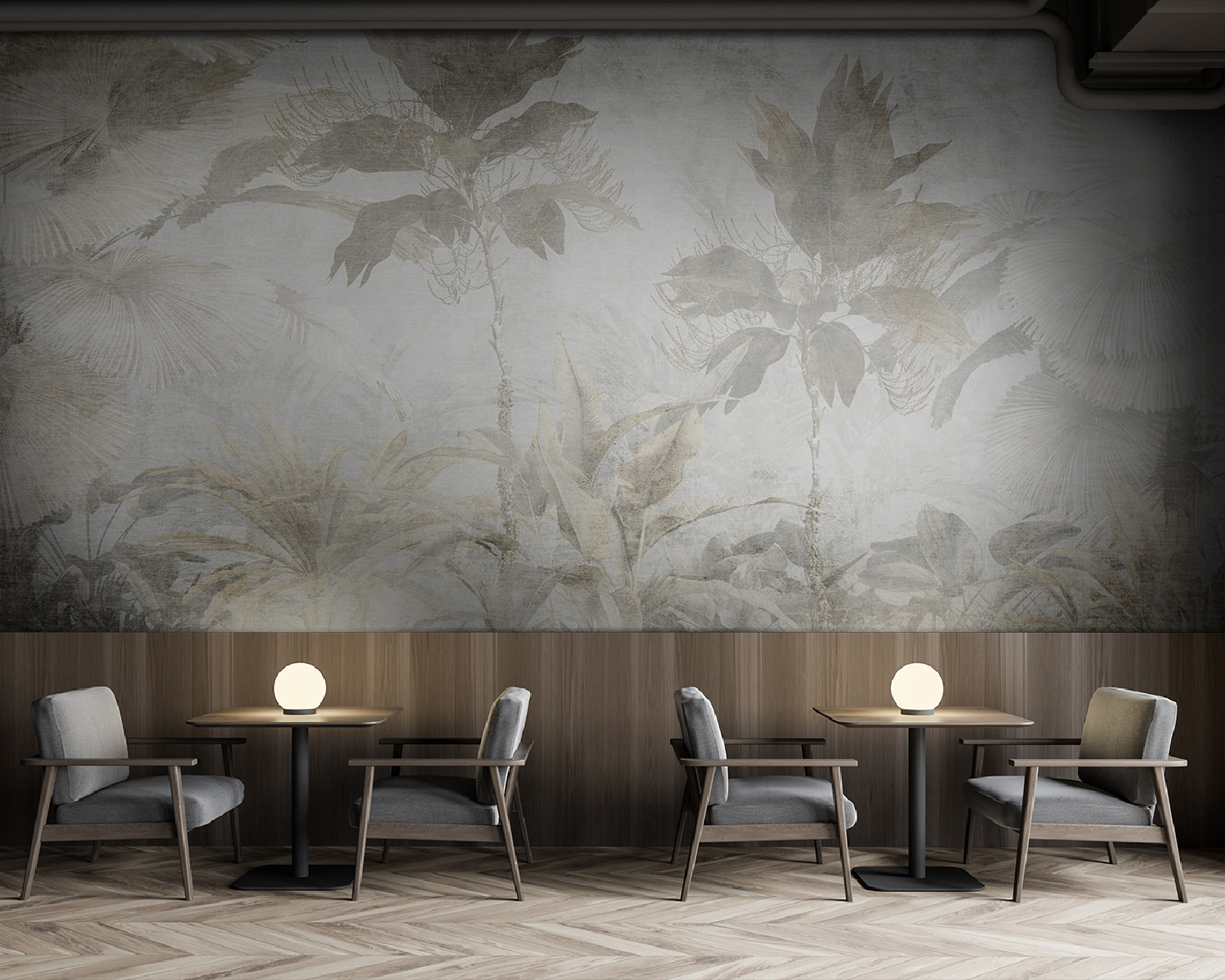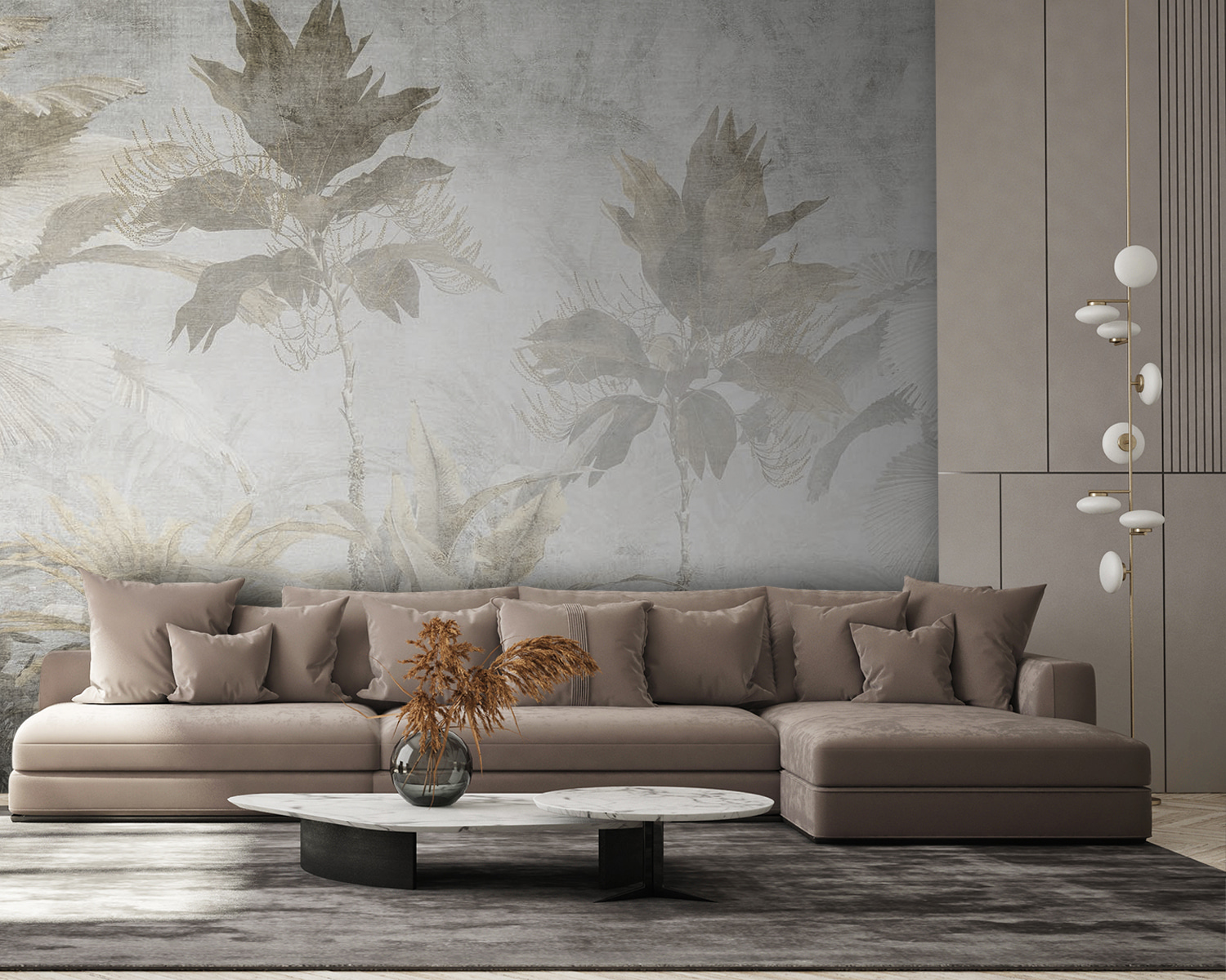 Această pictură murală se potrivește fără efort în orice cameră, fie că este vorba de un living confortabil, un dormitor senin sau chiar o cafenea șic. Tonurile atenuate creează o atmosferă liniștită, ca o șoaptă blândă în briza dimineții. Și acele frunze de palmier? Acestea adaugă o notă exotică care te face să te simți ca și cum ai fi fost transportat într-un paradis tropical.
