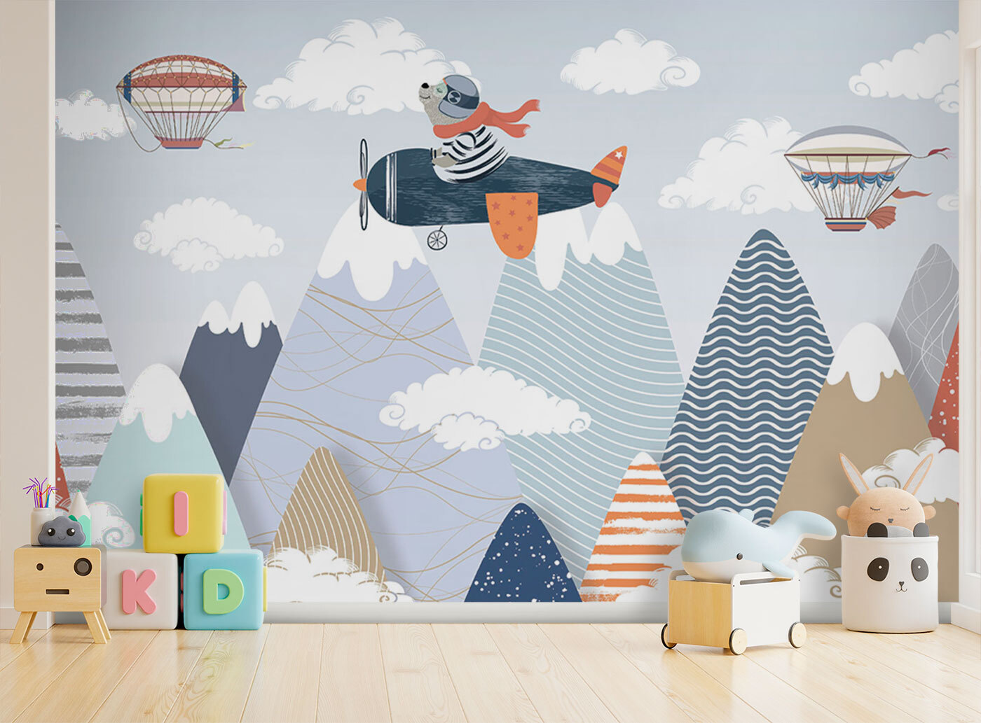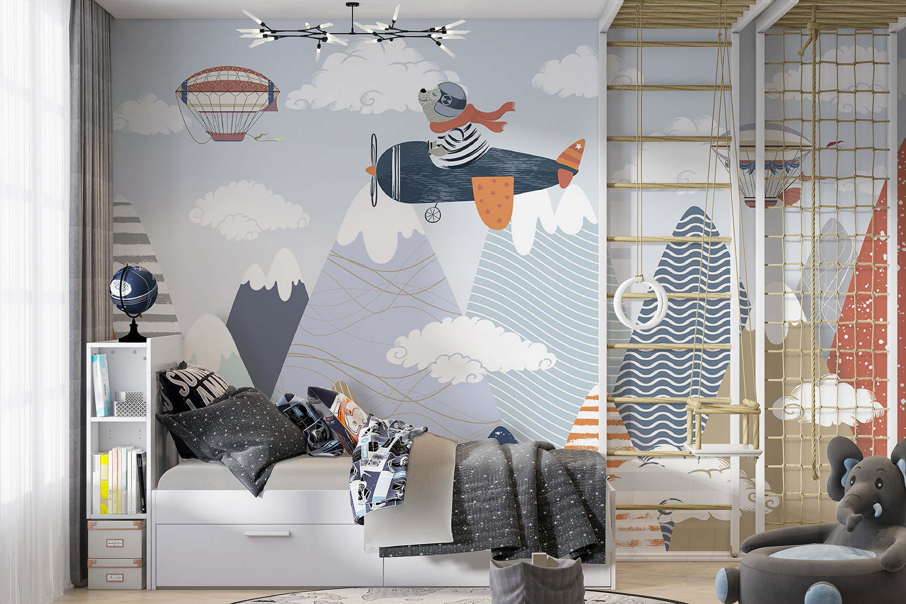 Imaginați-vă că intrați în camera copilului dvs. și sunteți întâmpinați de o scenă capricioasă care pare desprinsă direct dintr-o poveste de aventuri! Această pictură murală, cu baloane cu aer cald vesele care alunecă printre nori pufoși deasupra unor munți abstracți și colorați, va face ca orice spațiu să pară magic. Este perfect pentru a stârni imaginația copilului dumneavoastră – s-ar putea să simtă că își pilotează propria expediție spre cer. Culorile calde, confortabile și modelele jucăușe aduc un farmec deosebit. Perfectă pentru grădinițe sau camere de joacă, această pictură murală nu este doar decor, este un portal către aventuri nesfârșite! Visează mare, navighează înalt!
