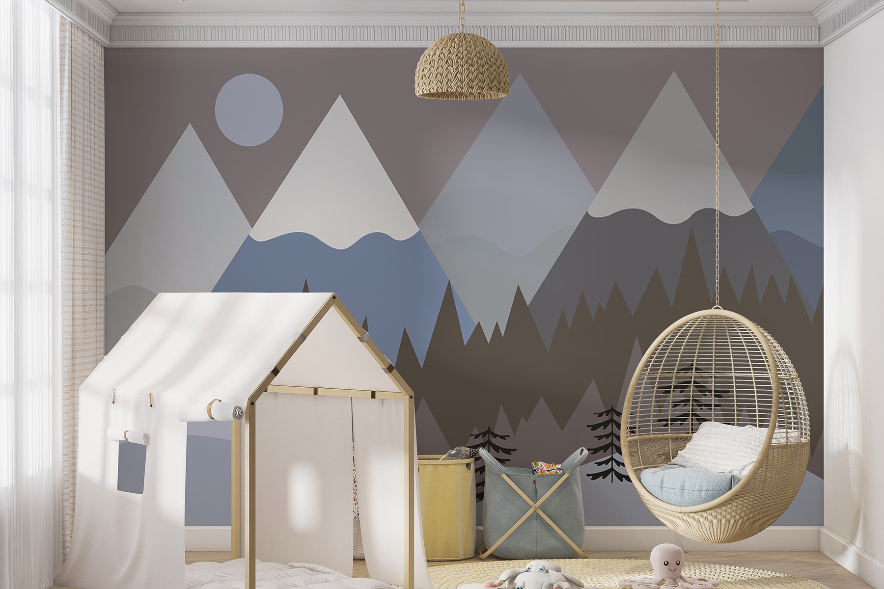 Această pictură murală jucăușă, “Cerc alb pe fond gri”, este ca o scenă desprinsă direct dintr-o carte de povești capricioasă! Este ascunsă în categoriile “Picturi murale pentru copii” și “Picturi murale populare” – acolo unde îi este locul. Imaginați-vă: îl instalați în camera micuțului dvs. și, dintr-o dată, spațiul se transformă într-o țară a minunilor de iarnă confortabilă. Acele culori blânde și liniștitoare de gri și alb, acoperite cu copaci și munți mici, ca niște stropi… Este ca o îmbrățișare dulce pentru pereții tăi. Și acel cerc alb? Ar putea fi luna sau chiar un bulgăre de zăpadă uriaș, în funcție de unde vă duce imaginația. Perfectă pentru copiii și adulții tineri la suflet, această pictură murală aduce un sentiment de calm și uimire. Gândiți-vă la ea ca la o stare de spirit instantanee, care stârnește bucurie de fiecare dată când treceți pe lângă ea.