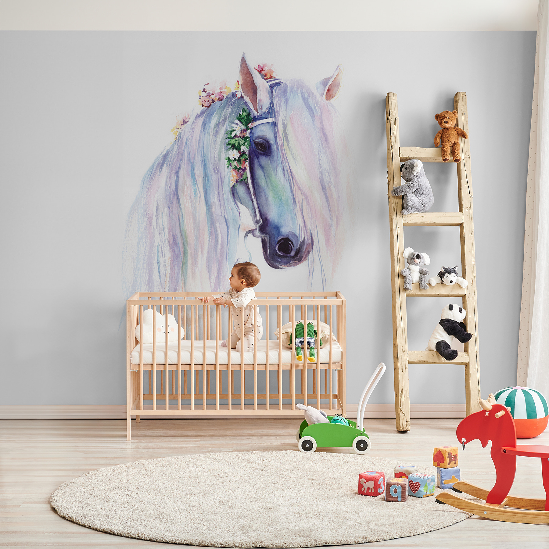 Înveseliți orice spațiu cu această pictură murală încântătoare cu un cal maiestuos împodobit cu flori. Imaginați-vă că intrați într-o cameră și sunteți întâmpinați de acest gigant blând, cu coama sa elegantă care se cascadează ca o cascadă de culori. Perfectă atât pentru copii, cât și pentru iubitorii de decoruri capricioase, aceasta aduce o notă de natură chiar în interior. Pastelurile moi fac ca totul să pară mai ușor, fiind greu să nu zâmbești. Imaginați-vă citind o poveste cu cei mici în timp ce vă cuibăriți lângă această pictură murală – fiecare privire este o mică aventură care așteaptă să se întâmple. Nu este doar o decorațiune, este o invitație la visare!