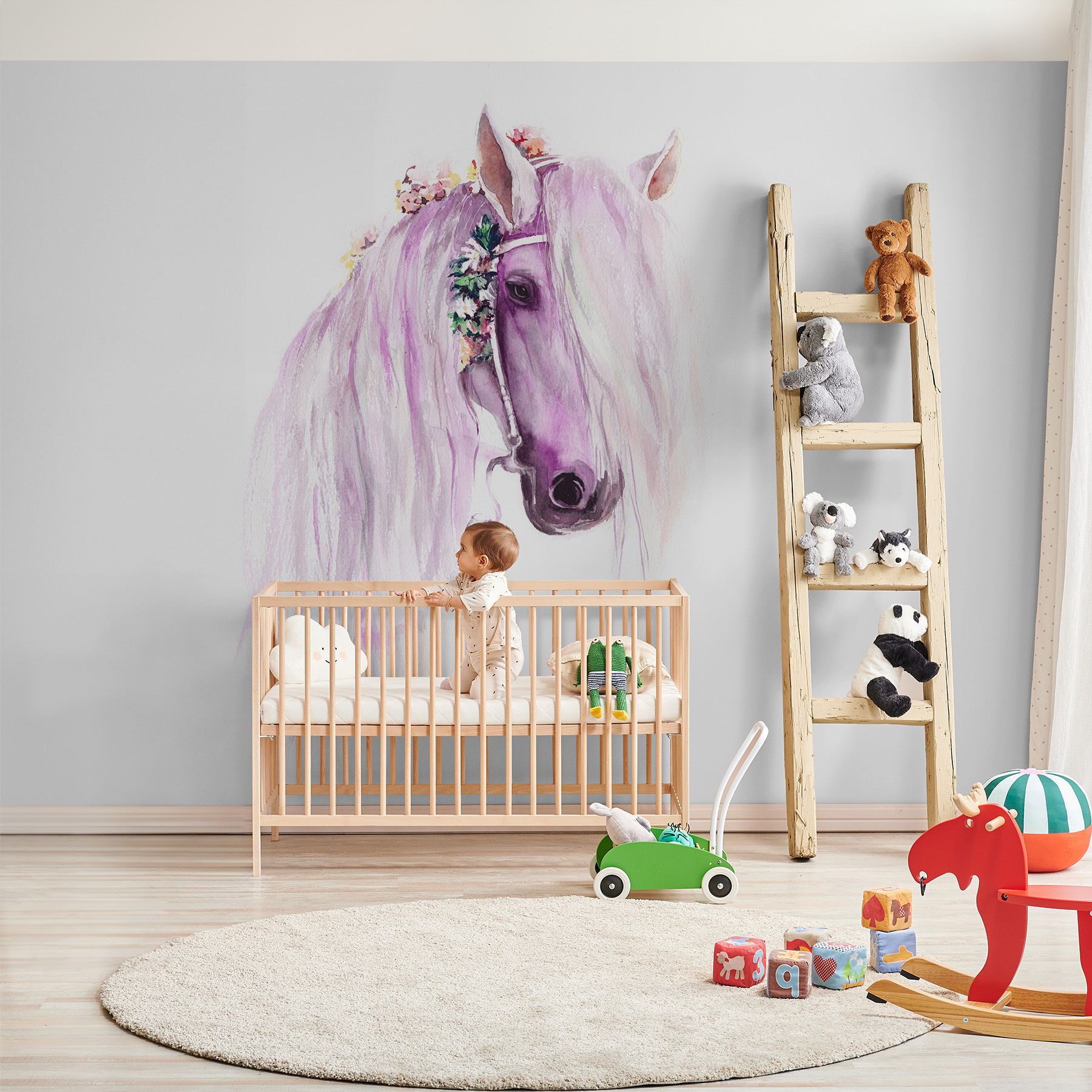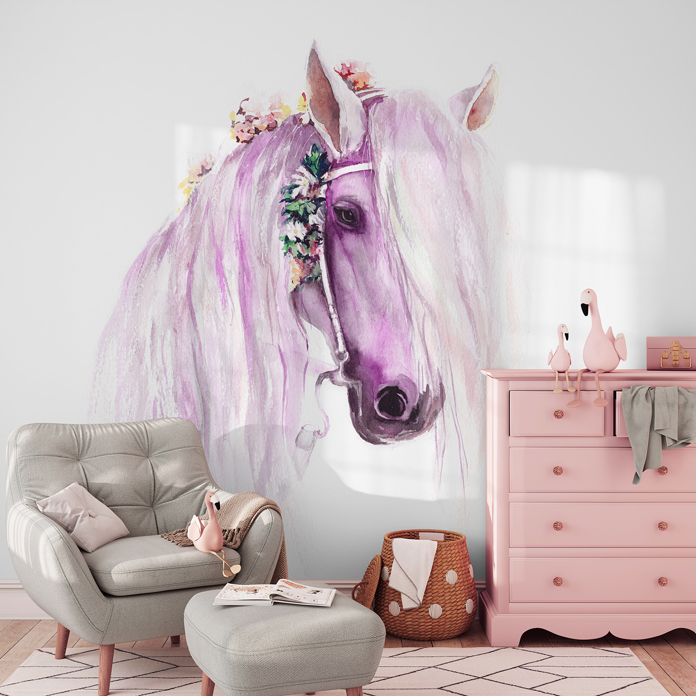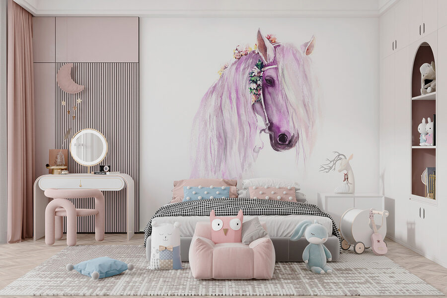 Transformați o cameră cu această pictură murală încântătoare în acuarelă cu un cal care pare desprins dintr-un basm. Imaginați-vă farmecul în timp ce cei mici îi privesc coama curgătoare, aducând un strop de fantezie în camera de joacă sau în camera copilului. Nu este doar o acoperire de perete; este o invitație la visare. Imaginați-vă după-amiezi leneșe petrecute imaginându-vă aventuri pe pajiști, culorile moi învăluind spațiul într-o îmbrățișare blândă. Această pictură murală oferă o evadare fermecătoare, perfectă pentru a alimenta imaginația tinerilor sau pur și simplu pentru a înveseli un perete monoton. Cine nu și-ar dori un prieten mitic ca acesta?