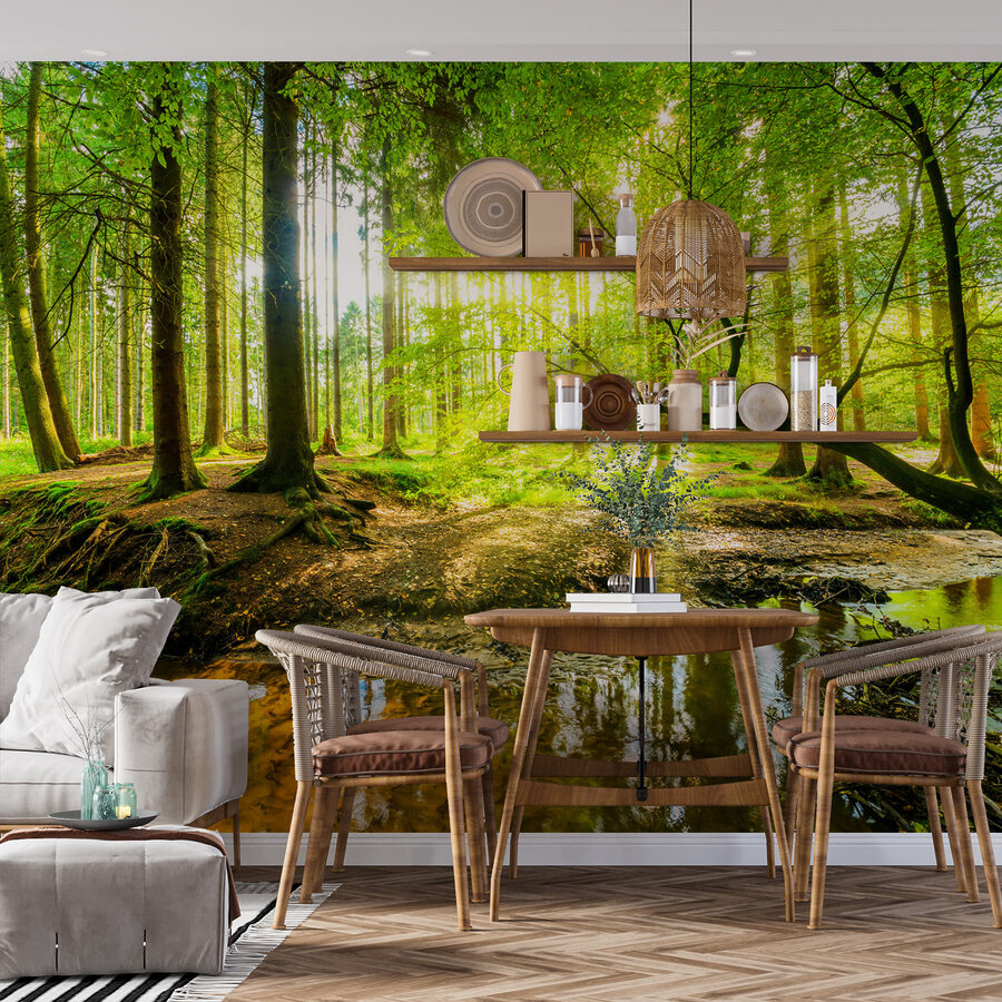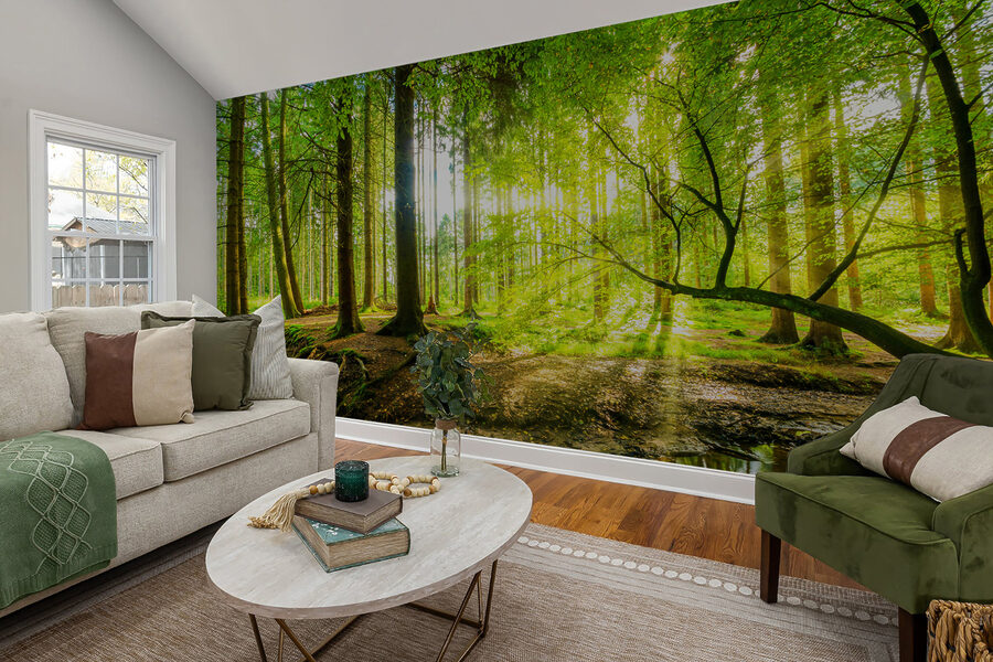 Imaginează-ți că pășești în propria ta mică retragere în pădure de fiecare dată când intri în cameră. Această pictură murală aduce o scenă de pădure vibrantă chiar în spațiul dvs., cu copaci înalți și lumina soarelui care filtrează prin frunze. Este ca și cum natura însăși a decis să se mute aici. Imaginează-ți cum te relaxezi cu o carte bună, înconjurat de nuanțe de verde și de vibrațiile moi și pământii ale unei păduri. Și dacă ai nevoie vreodată de un moment de evadare din cotidian, această pictură murală te acoperă. Perfectă pentru a visa cu ochii deschiși la drumeții și aventuri în aer liber, sau doar pentru a vă bucura de o seară confortabilă în interior. Este o atingere de liniște care are un mare impact, transformând orice perete într-o gură de aer proaspăt. Cine ar putea rezista?