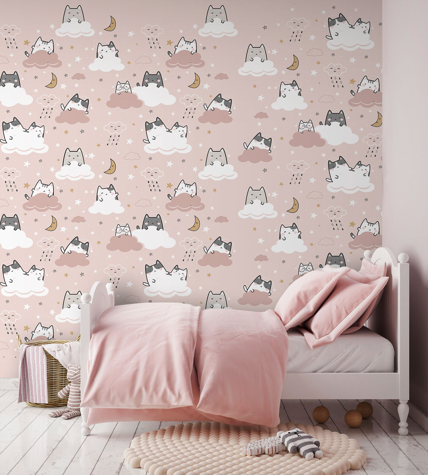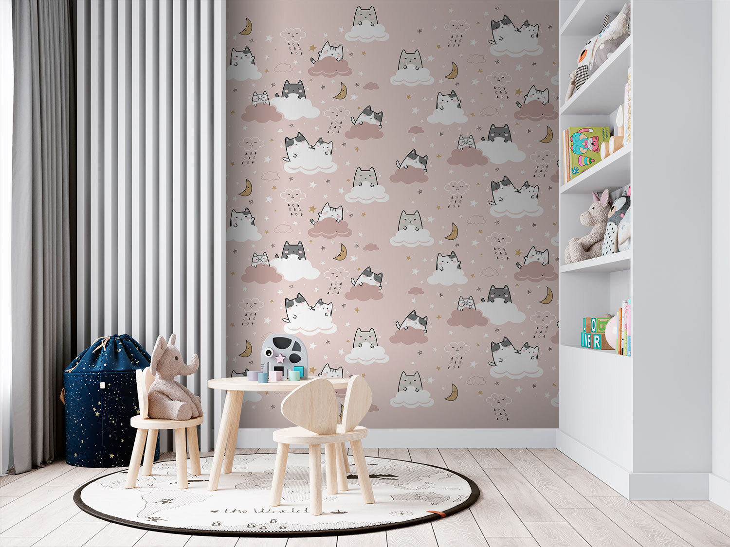 Imaginați-vă că pășiți într-o cameră în care pereții sunt un vis de zi capricios. Salutați pictura murală “Pattern of Cats on Clouds”. Este ca și cum universul a decis să împrăștie un pic de ilaritate cu pisici care se întind pe perne pufoase de aer oriunde te uiți. Perfect pentru camera celui mic – sau, hei, poate chiar pentru a ta – nu judecăm!