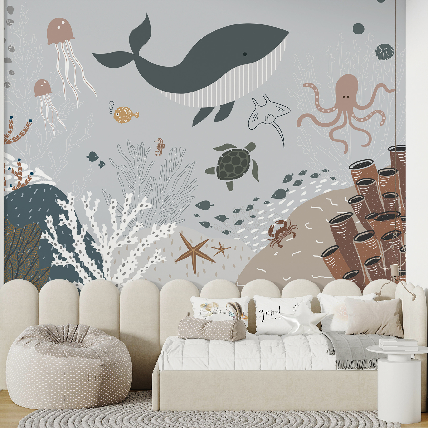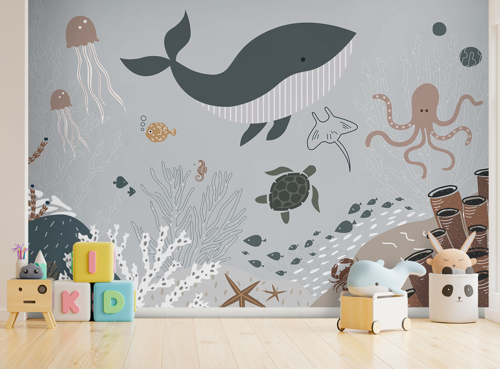 Imaginați-vă că transformați camera micuțului dvs. într-o lume subacvatică încântătoare cu această pictură murală jucăușă “Desen animat al unei balene”. Perfectă pentru camera oricărui copil, pictura murală prezintă creaturi marine prietenoase precum balene, țestoase și meduze în nuanțe moi de acuarelă. Este ca și cum ai aduce o felie de ocean în casa ta fără să te uzi!