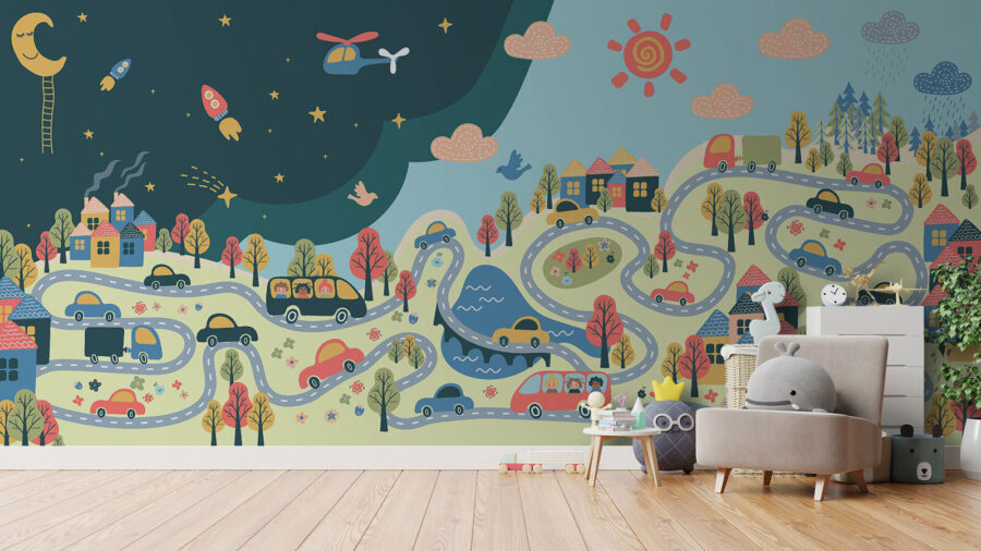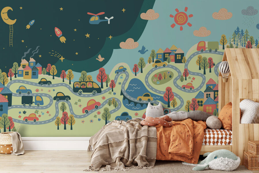 Această pictură murală “Desen animat cu un elicopter și o rachetă pe cer” aduce o întreagă lume capricioasă în camera copilului dvs. Imaginați-vă că micuții dvs. se culcă sub un cer nocturn de vis, cu rachete ciripitoare și un elicopter prietenos, ca și cum ar face parte dintr-o aventură fermecătoare dintr-o carte de povești. Nu este vorba doar de decorare; este ca și cum ai da frâu liber imaginației lor. Culorile pastelate calde și scenele jucăușe îl fac să se simtă ca o mare îmbrățișare reconfortantă pe perete, ideală pentru a stârni povești nesfârșite înainte de culcare. S-ar putea chiar să vă treziți zâmbind de fiecare dată când intrați!