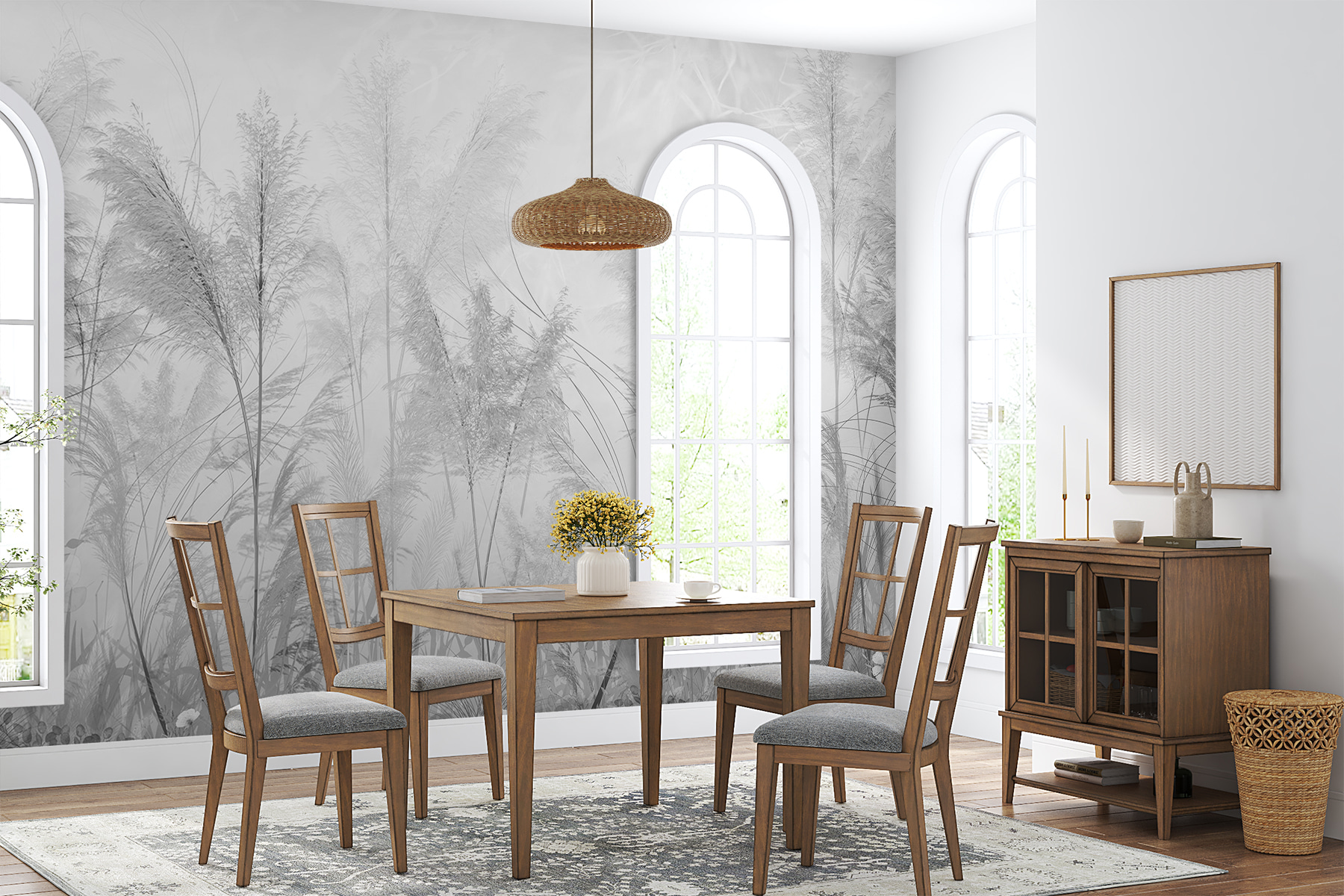 Imaginați-vă asta: Intrați în spațiul dvs. și acesta se transformă brusc cu iarbă înaltă legănându-se ușor într-un peisaj cețos chiar pe peretele dvs. Această pictură murală este ca și cum ai păși într-un vis, unde roua de dimineață încă se agață de pânza naturii. Este perfect pentru oricine dorește să aducă o bucată de peisaj liniștit în interior. Imaginați-vă citind cartea preferată sau sorbind ceai fierbinte cu acest fundal senin; este ca o gură de aer proaspăt, fără mușcăturile de insecte. Acest design se îmbină fără efort cu decorul modern, adăugând în același timp o notă de fantezie și calm. Alegerea ideală pentru serile de iarnă în care doriți o atingere a naturii cu o întorsătură artistică. Această pictură murală bifează toate căsuțele potrivite!