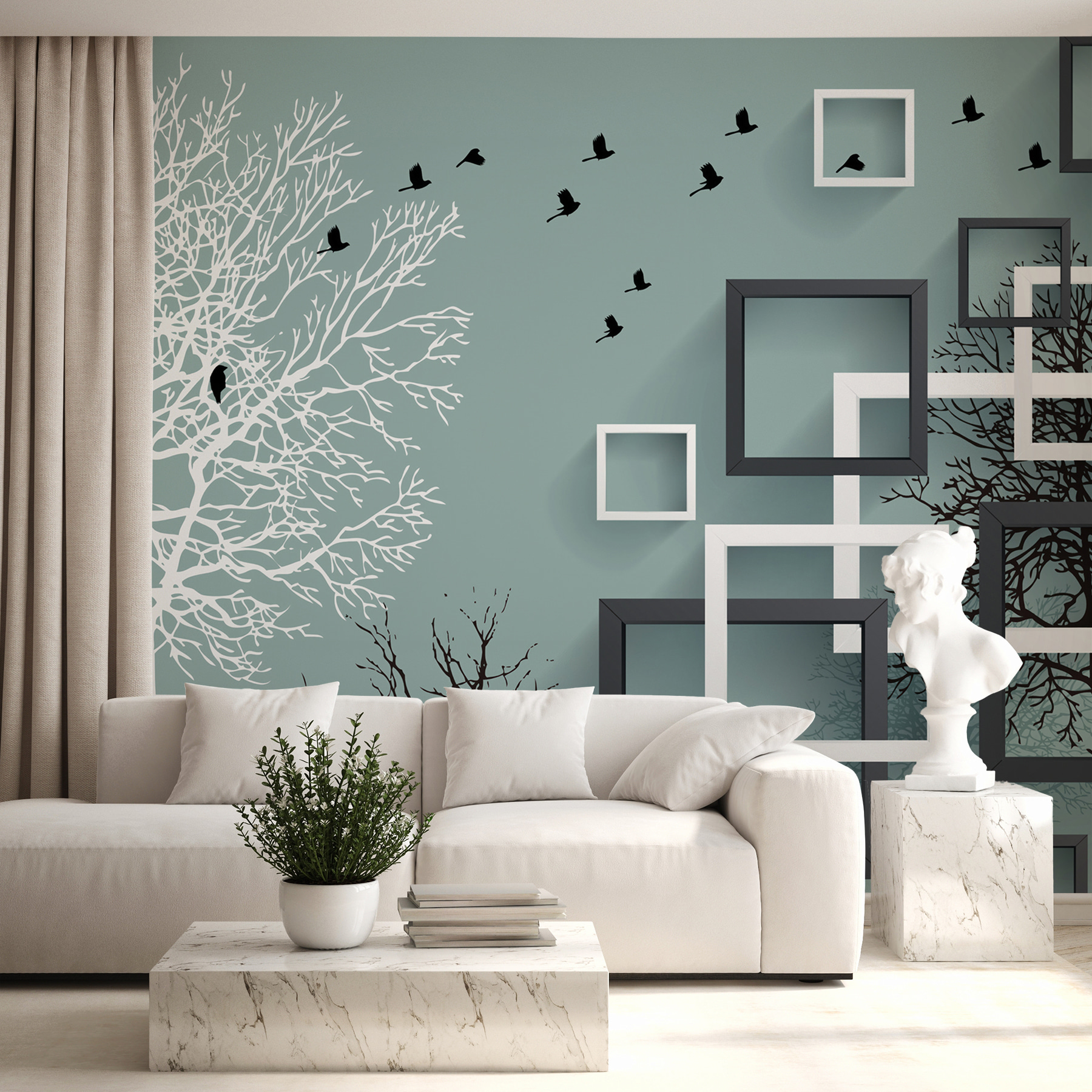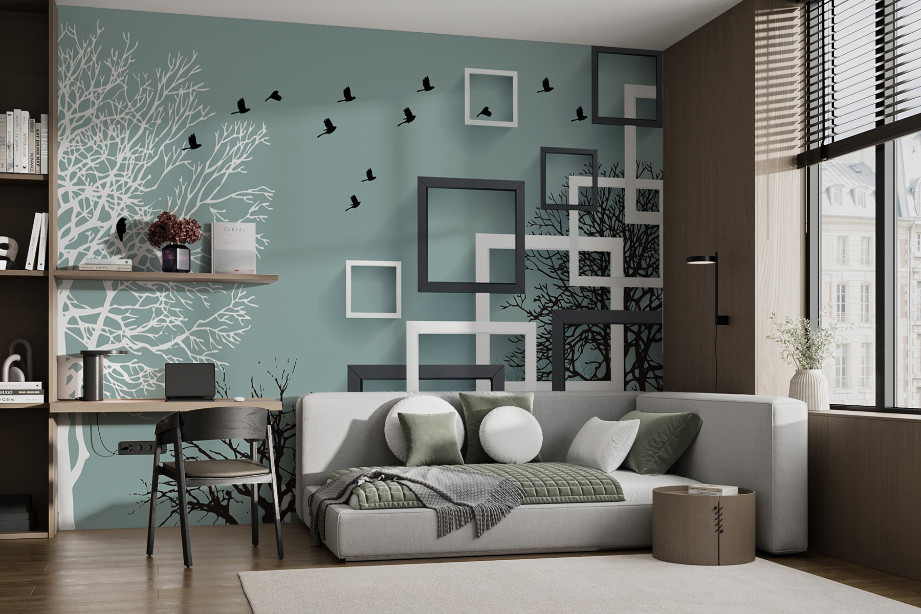 Imaginați-vă că intrați într-o cameră și simțiți instantaneu o gură de aer proaspăt. Aceasta este vibrația pe care o aduce această pictură murală! Cu copacii săi eleganți și păsările jucăușe, aceasta transformă orice spațiu într-o mică felie de natură. Este ca și cum exteriorul s-ar fi invitat chiar în casa ta. Și aceste rame geometrice? Adaugă o notă excentrică, făcând-o să pară artistică fără a încerca prea mult.