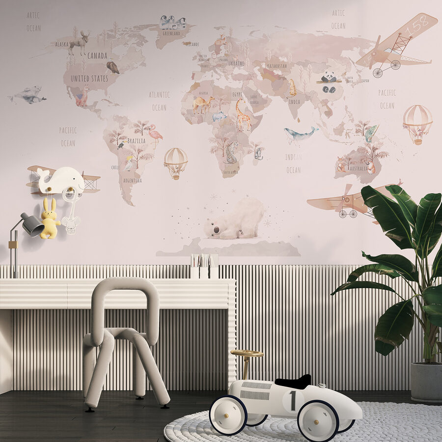 Transformați orice cameră într-o călătorie capricioasă în jurul lumii cu această pictură murală încântătoare, “Harta lumii”. Este ca o scrisoare de dragoste pentru aventură, cu ilustrații încântătoare de animale și avioane jucăușe, care stârnesc instantaneu curiozitatea și dorința de călătorie. Imaginați-vă că cei mici își arată țările preferate sau visează la ținuturi exotice în timp ce sunt înconjurați de aceste desene fermecătoare. Cu culori blânde și elemente jucăușe, aceasta transformă pereții într-o pânză a imaginației – perfectă pentru grădinițe sau camere de joacă. Această pictură murală nu doar decorează; ea invită la povești și vise. Așadar, hai să explorăm!