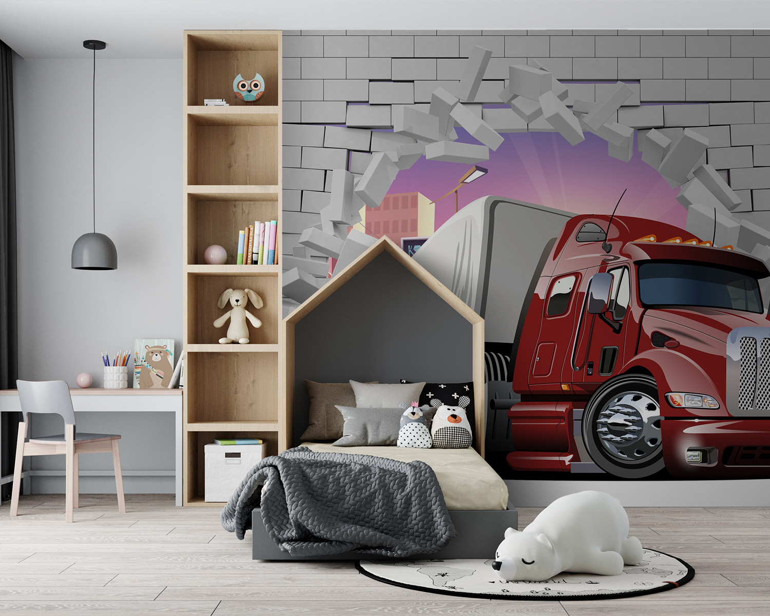 Această pictură murală se numește “Camionul străpunge peretele” și, într-adevăr, se ridică la înălțimea numelui său! Imaginează-ți că un camion roșu masiv pătrunde prin peretele camerei tale de zi – este ca și cum ai trăi o scenă dintr-un film de acțiune. Ai un copil obsedat de mașini? Acest lucru i-ar da pe spate și poate i-ar determina să își facă temele într-o clipită (degetele încrucișate)! Detaliile sunt atât de clare, încât aproape că îți vine să te rățoi! Perfect pentru a adăuga o notă de distracție unei camere de copii sau chiar unui garaj. Oamenii se vor gândi de două ori de fiecare dată când trec pe lângă el. În plus, nu este doar pentru copii – pasionații de mașini ar fi înnebuniți după asta. Îmbunătățiți vibrația spațiului dvs. cu această pictură murală atrăgătoare, care stârnește conversația. Este neașteptată, unică și un pic rebelă!