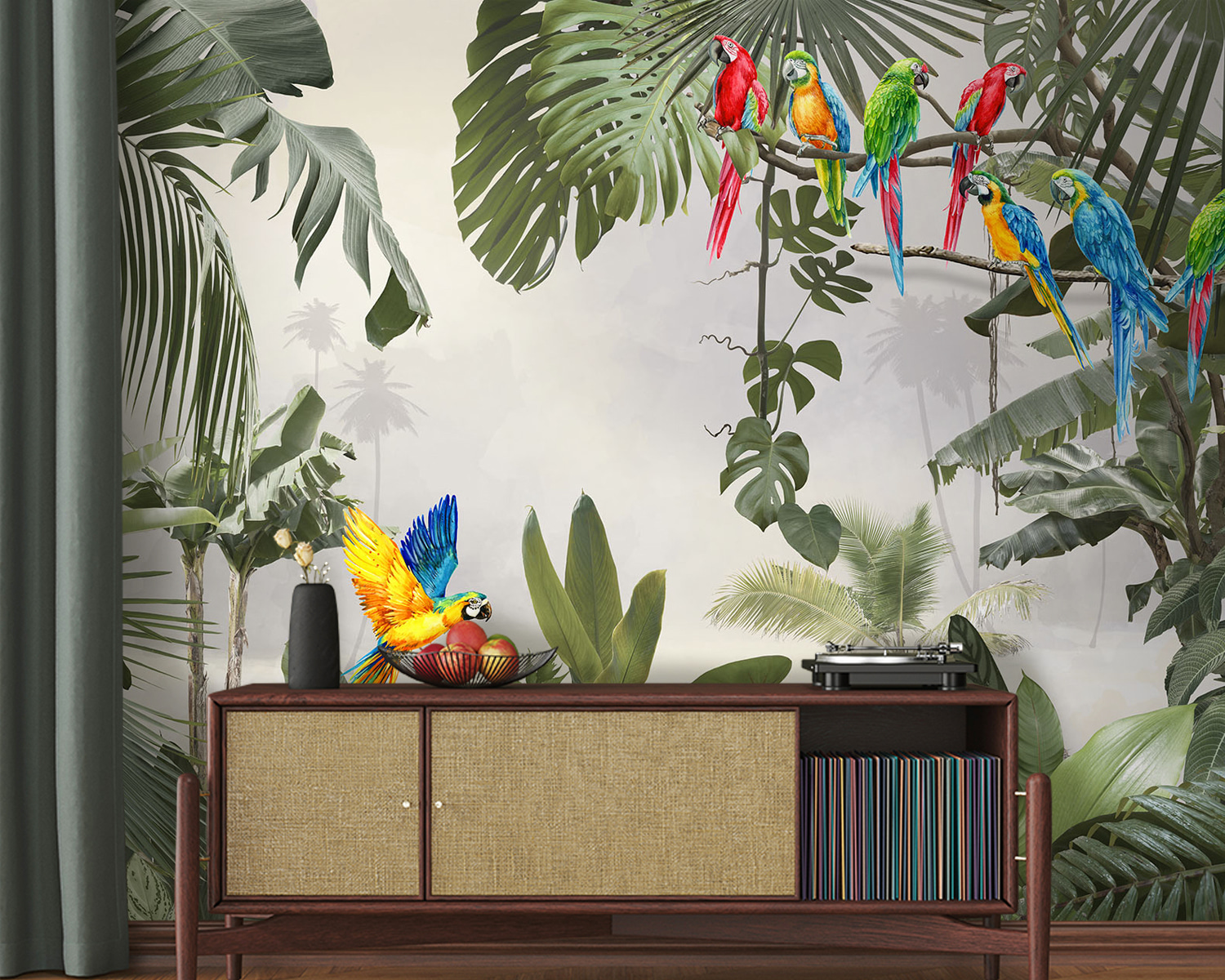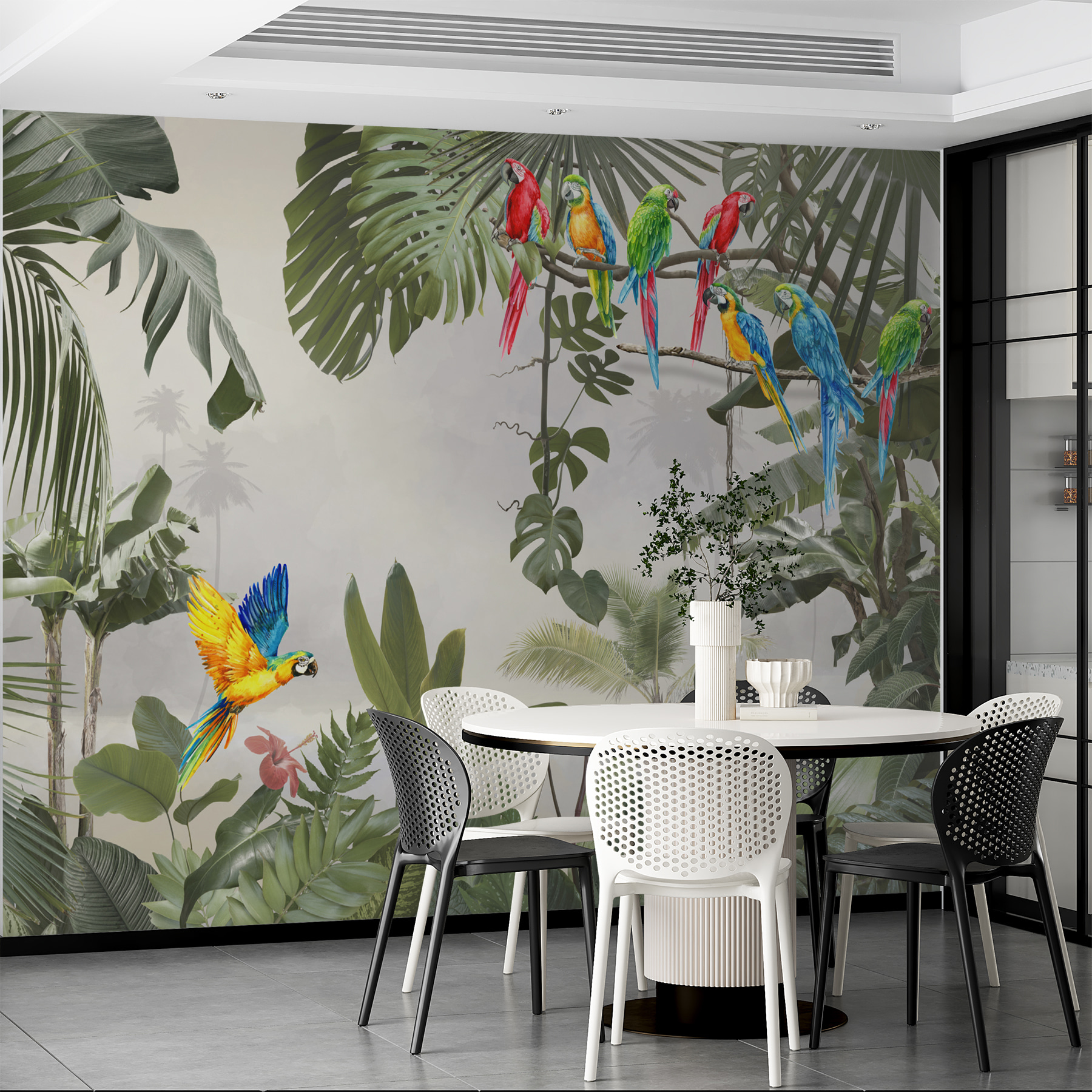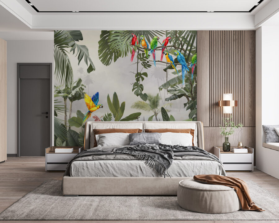 V-ați gândit vreodată să aduceți un paradis tropical chiar în camera dvs. de zi? Această pictură murală cu un papagal uimitor albastru și galben cocoțat pe o creangă ar putea fi atingerea perfectă. Imaginați-vă culorile vibrante și detaliile complicate care vă înveselesc instantaneu spațiul – este ca o mini-vacanță de fiecare dată când intrați în cameră. Amestecul de frunze verzi și exploziile de culoare ale papagalilor îl fac să pară atât de viu și exotic. De asemenea, începe perfect conversația. (În plus, este o stare de spirit garantată în zilele gri!) Fie că este pentru un perete în camera de zi, în dormitor sau chiar într-un spațiu de lucru, această pictură murală transformă orice perete obișnuit într-o evadare uluitoare. Te vei simți ca și cum ai fi pășit într-o junglă tropicală, chiar din confortul casei tale. Haideți, lăsați pereții dvs. să spună o poveste!