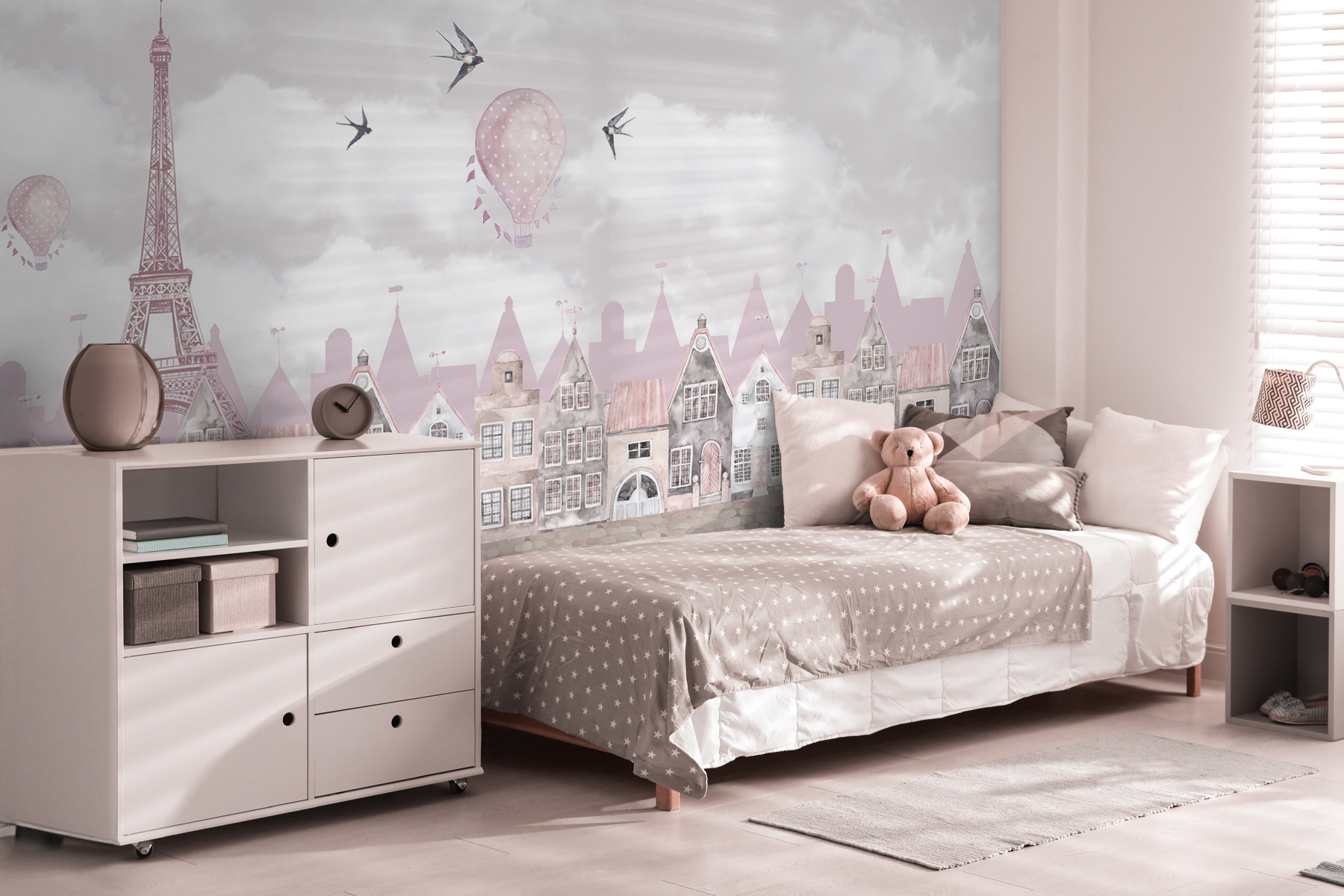 Imaginați-vă că intrați într-o cameră și sunteți întâmpinați de priveliștea încântătoare a păsărilor zburând pe un cer capricios, a baloanelor cu aer cald plutind ușor și a acoperișurilor fermecătoare desprinse direct dintr-un basm. Această pictură murală “Pasăre zburând pe cer” aduce această fantezie la viață. Perfectă pentru camera unui copil, aceasta stârnește imaginația și umple spațiul cu o atmosferă de vis. Culorile blânde, pastelate și detaliile delicate nu o fac doar o pictură murală, ci o poveste în care poți intra. Este ceva atât de liniștitor să privești păsărelele, este ca o briză ușoară pentru suflet. În plus, cine nu și-ar dori o notă de magie pe pereții săi? Această pictură murală este un amestec încântător de eleganță și joacă – ideală pentru a crea o atmosferă confortabilă și încântătoare în camera oricărei fete.