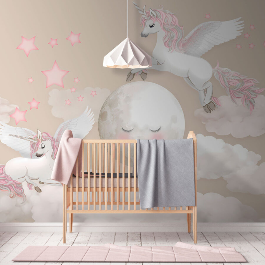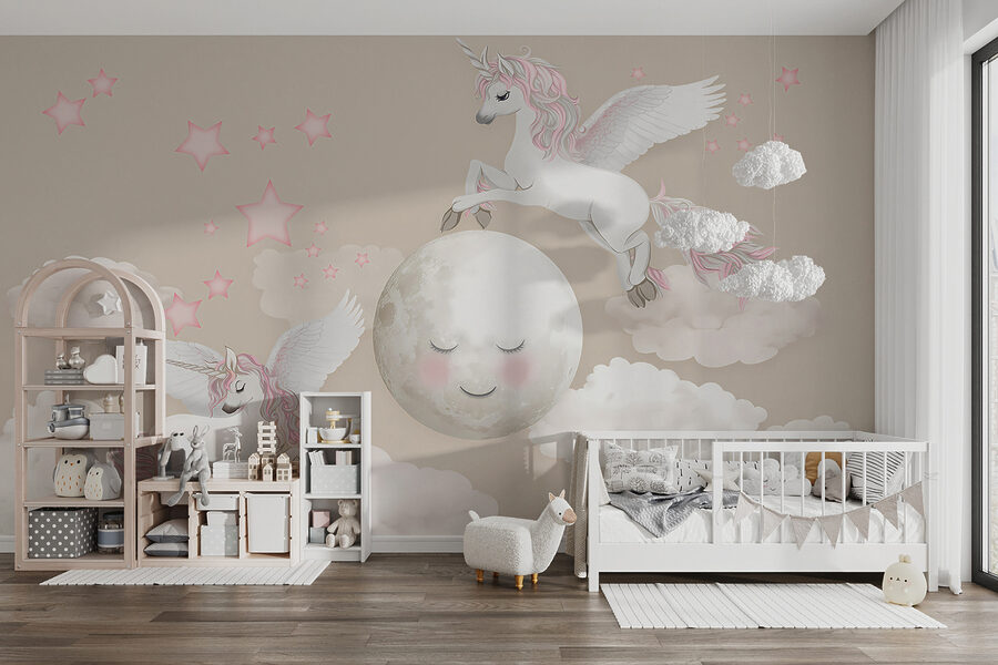 Imaginați-vă acest lucru: camera copilului dvs. transformată într-un tărâm de vis capricios cu acest adorabil perete mural “Unicorn cu aripi și corn”. Este plină de nori pufoși, stele sclipitoare și cei mai drăguți și mai magici unicorni care zboară. Întreaga atmosferă este blândă, visătoare și perfectă pentru a stârni imaginația celui mic. Imaginați-vă povești înainte de culcare sub privirea blândă a acestor unicorni fermecați – fiecare noapte simțindu-se ca o călătorie într-un regat îndepărtat de basm. Este ca și cum ai avea o bucată de magie chiar acolo pe perete, creând momente de bucurie și uimire, iar și iar.