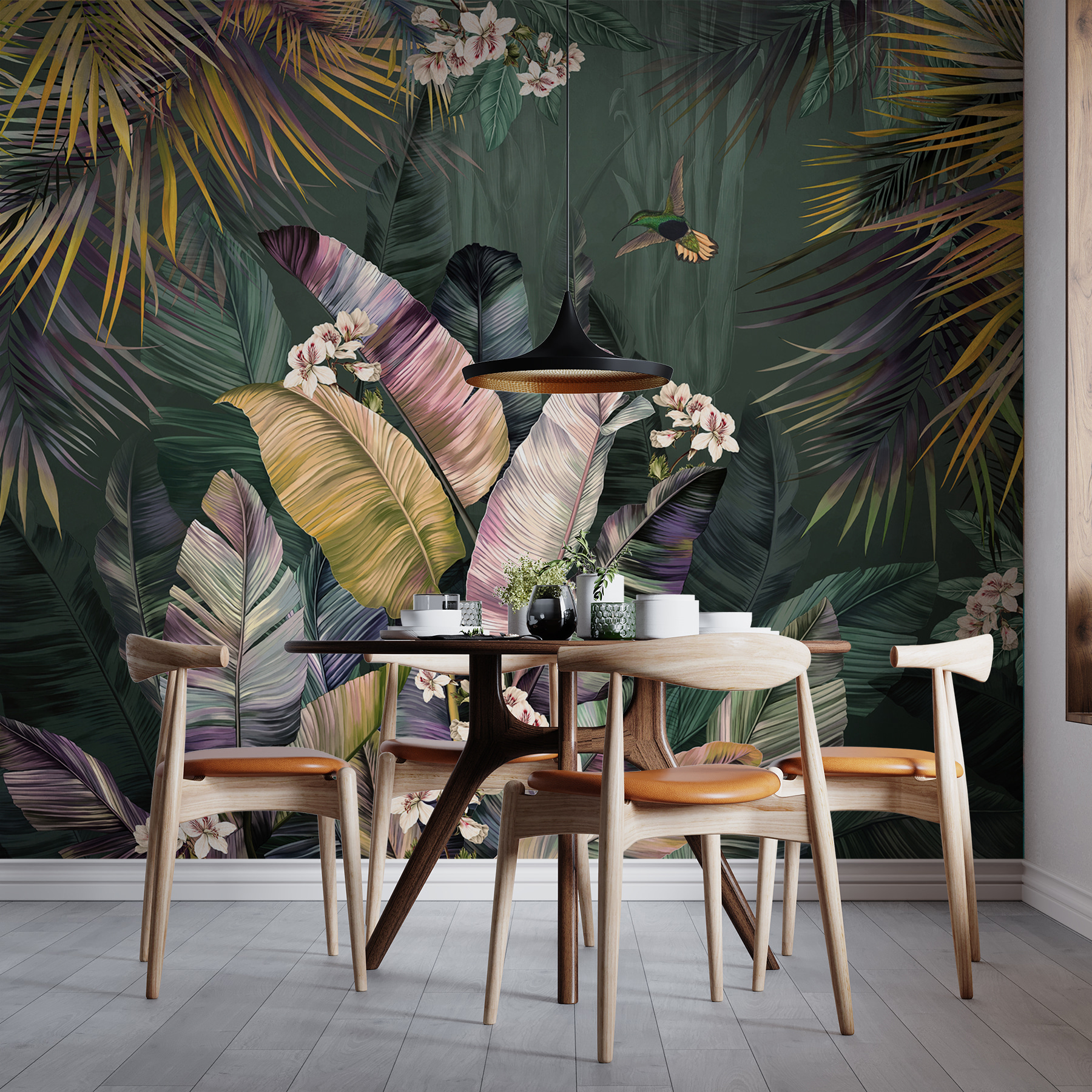Imaginați-vă că ajungeți acasă în propriul paradis tropical, cu acest mural uimitor “Colibri zburând în aer” pe perete. Verdele vibrant, frunzișul luxuriant și indicii de flori delicate creează o atmosferă de junglă luxuriantă care vă va face să vă simțiți ca și cum ați pășit într-o pădure tropicală senină. Oh, și fermecătoarea pasăre colibri care zburdă în jur? Adaugă un strop de magie – ca micul dans vesel al naturii chiar în sufrageria dvs.