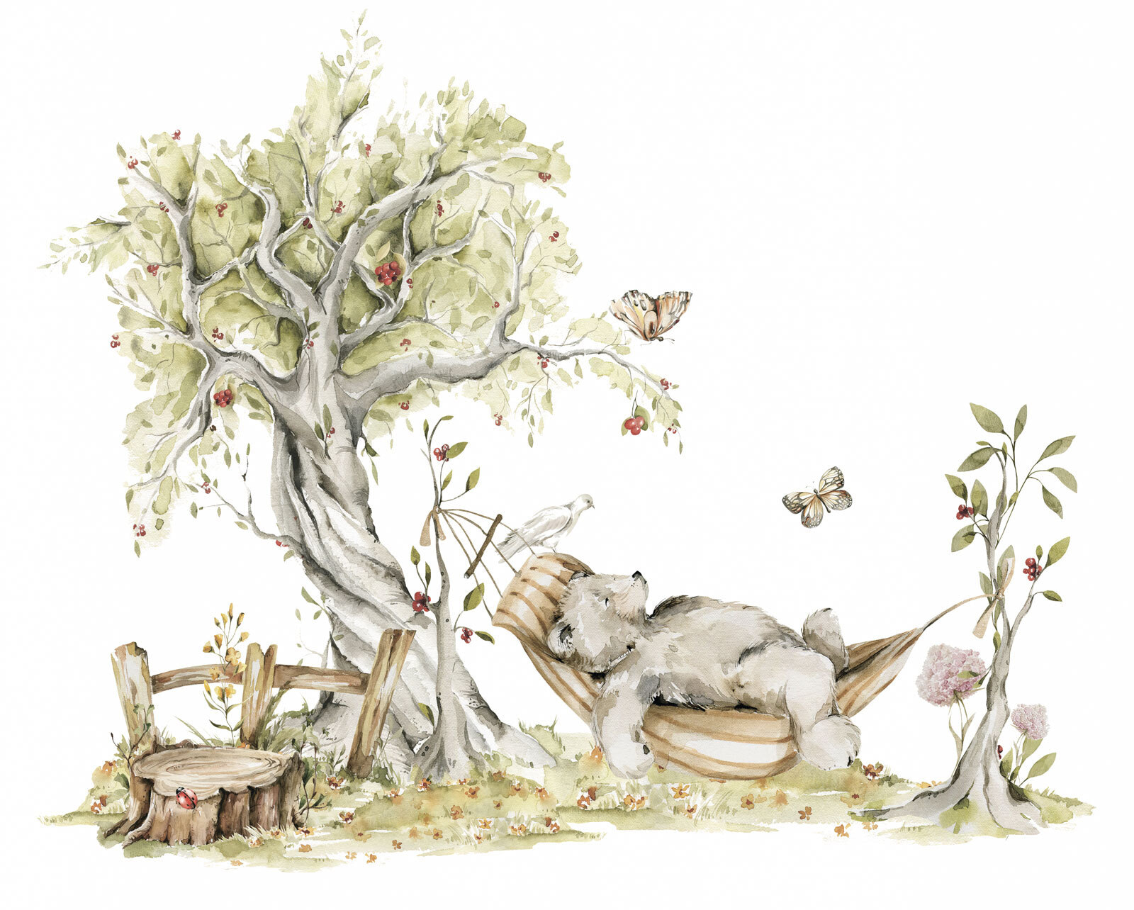 Nu este acesta cel mai drăguț? Imaginează-ți această pictură murală, “Ursul visează cu ochii deschiși într-un hamac liniștit”, în camera micuțului tău – vorbești despre o evadare de vis! Imaginați-vă un urs confortabil stând într-un hamac sub un copac ciudat, cu fluturi fluturând pe lângă el. Este ca o scenă dintr-un basm, perfectă pentru a crea acele vibrații magice în grădinițe sau zone de joacă.