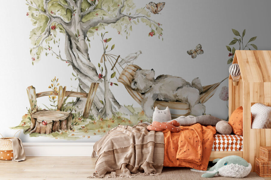 Nu este acesta cel mai drăguț? Imaginează-ți această pictură murală, “Ursul visează cu ochii deschiși într-un hamac liniștit”, în camera micuțului tău – vorbești despre o evadare de vis! Imaginați-vă un urs confortabil stând într-un hamac sub un copac ciudat, cu fluturi fluturând pe lângă el. Este ca o scenă dintr-un basm, perfectă pentru a crea acele vibrații magice în grădinițe sau zone de joacă.
