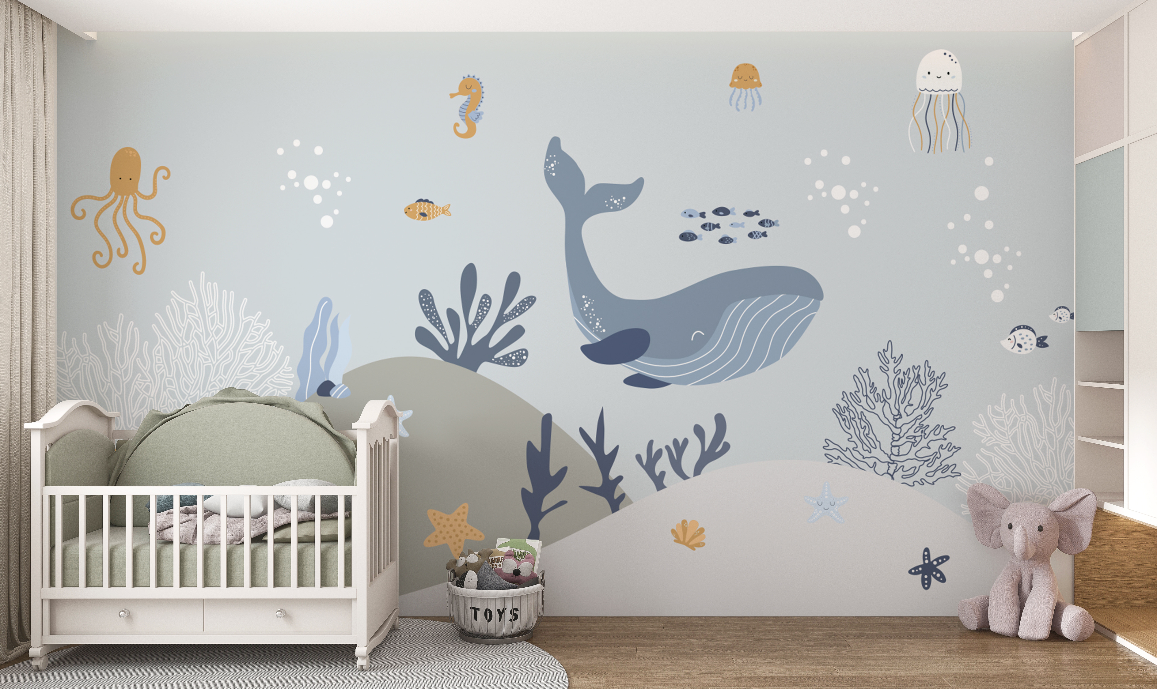 Adăugarea acestei picturi murale ar putea face poveștile de culcare despre prietenii subacvatici și mai interesante. Adorabilele caracatițe, balene și stele de mare aproape că par să prindă viață, invitându-i pe copii la nenumărate aventuri pline de imaginație. În plus, culorile blânde și creaturile prietenoase reprezintă fundalul perfect atât pentru somn, cât și pentru joacă.