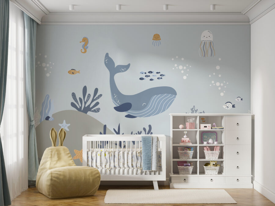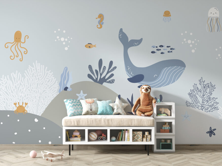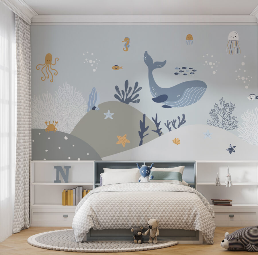 Adăugarea acestei picturi murale ar putea face poveștile de culcare despre prietenii subacvatici și mai interesante. Adorabilele caracatițe, balene și stele de mare aproape că par să prindă viață, invitându-i pe copii la nenumărate aventuri pline de imaginație. În plus, culorile blânde și creaturile prietenoase reprezintă fundalul perfect atât pentru somn, cât și pentru joacă.