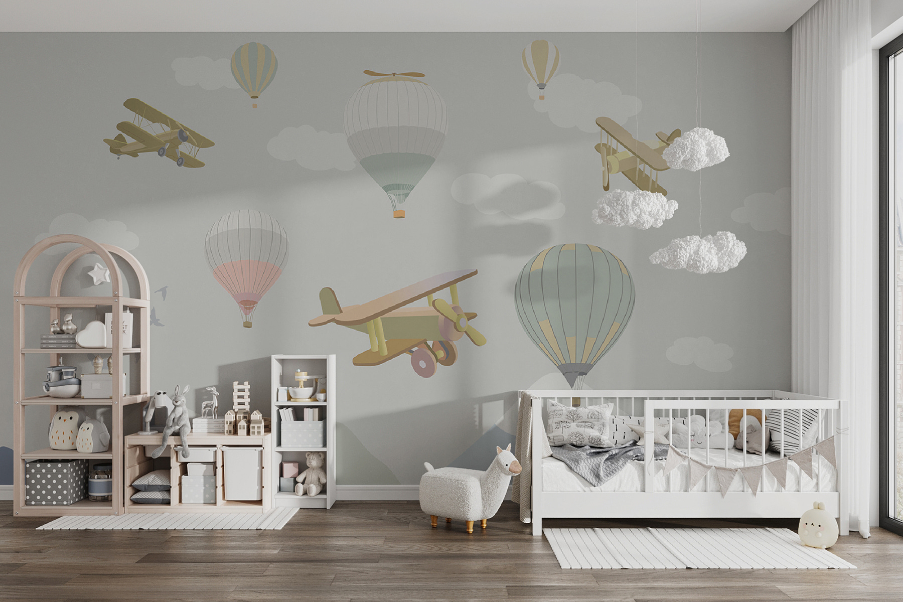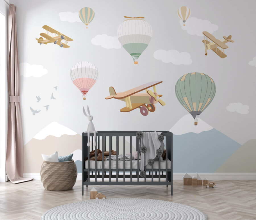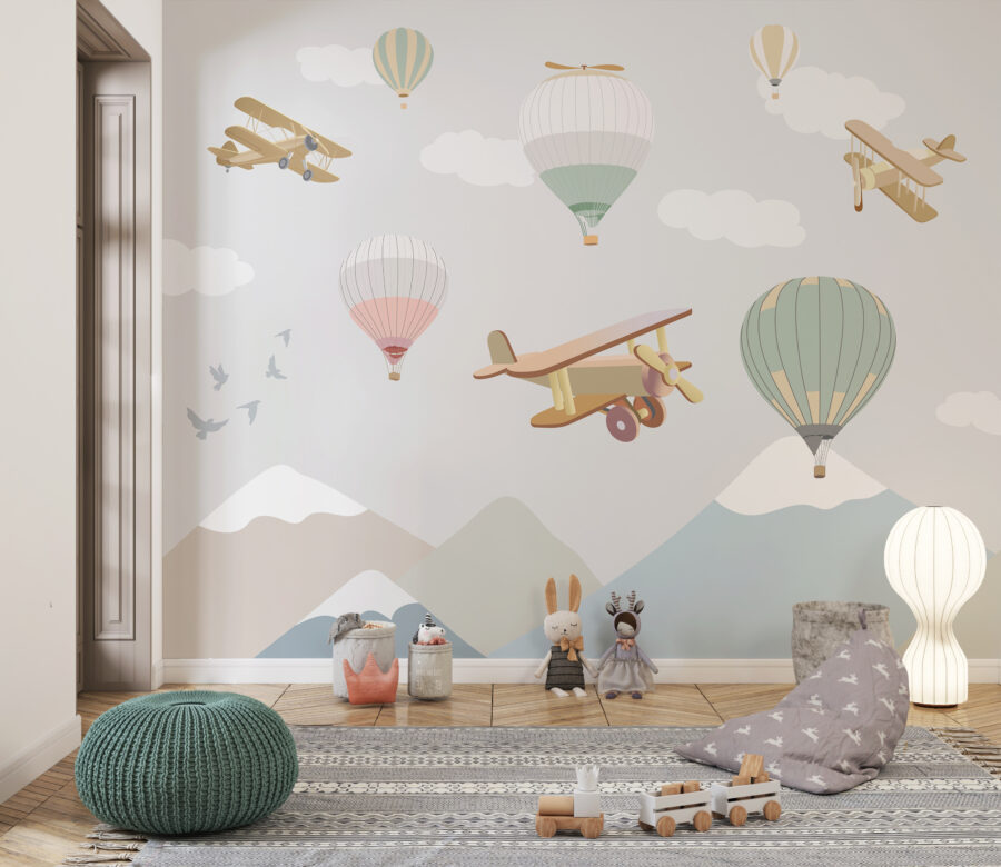 Aveți un aventurier sălbatic în familie? Peretele mural “Balon cu aer cald pe cer” este ca și cum ai deschide o fereastră către un tărâm de vis capricios. Perfectă pentru grădinițe și camerele micilor exploratori, această pictură murală prezintă baloane cu aer cald și avioane de epocă în culori pastelate, pe fundalul unor nori pufoși și blânzi, zburând deasupra unor munți senini. Imaginați-vă aceste chicoteli mici în timp ce copilul dvs. plutește în somn, visând la aventuri de zbor! Este liniștitor, dar incitant, stimulând imaginația în timp ce păstrează lucrurile atât de confortabile. Vise plăcute garantate!