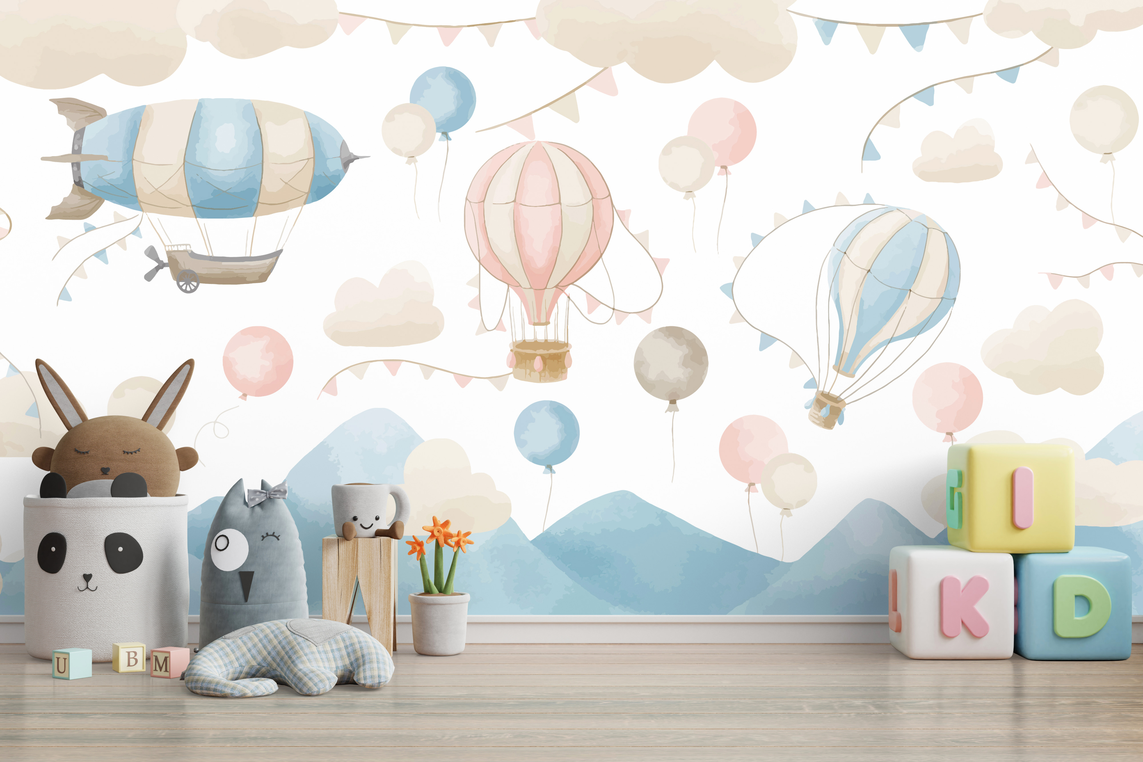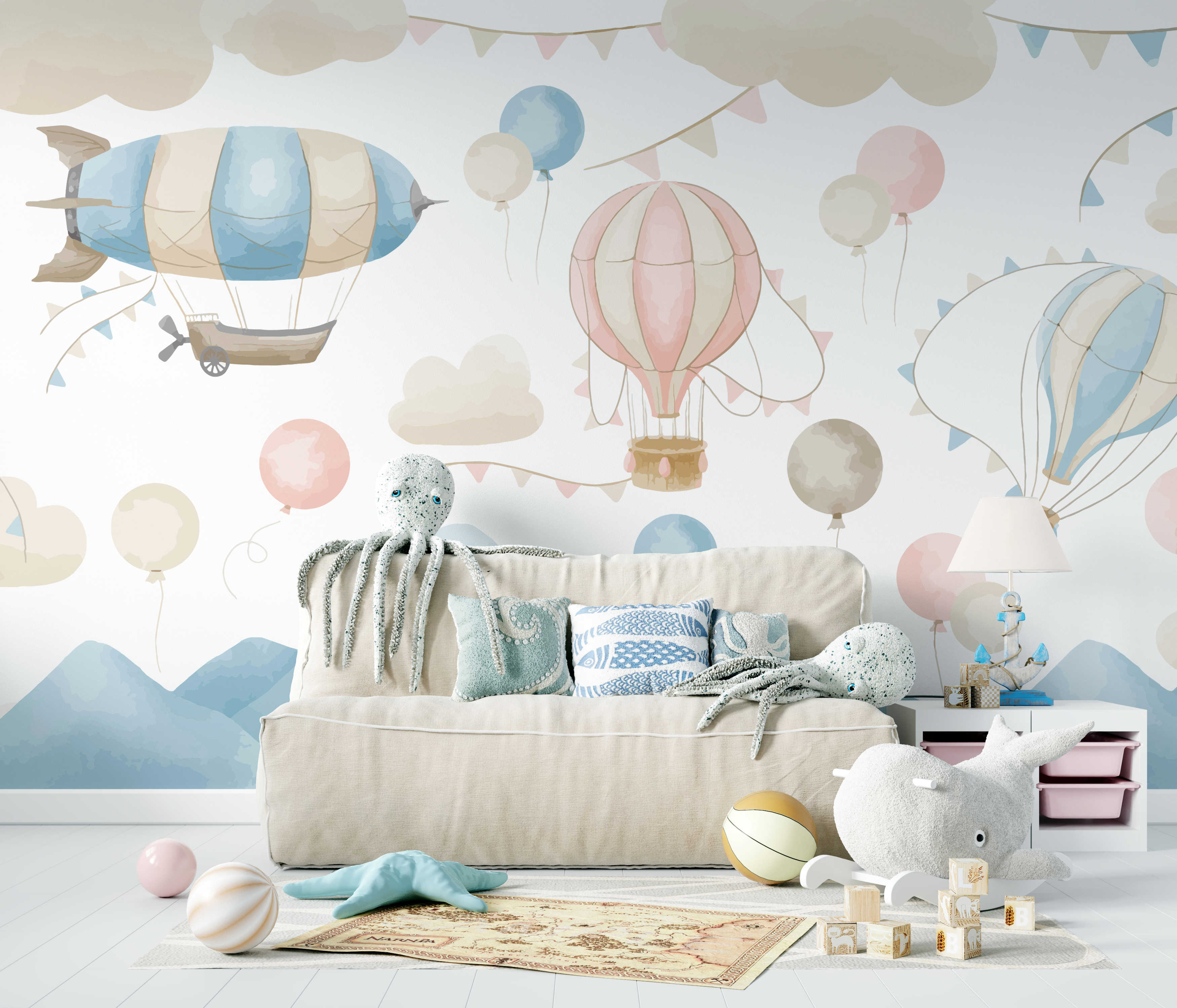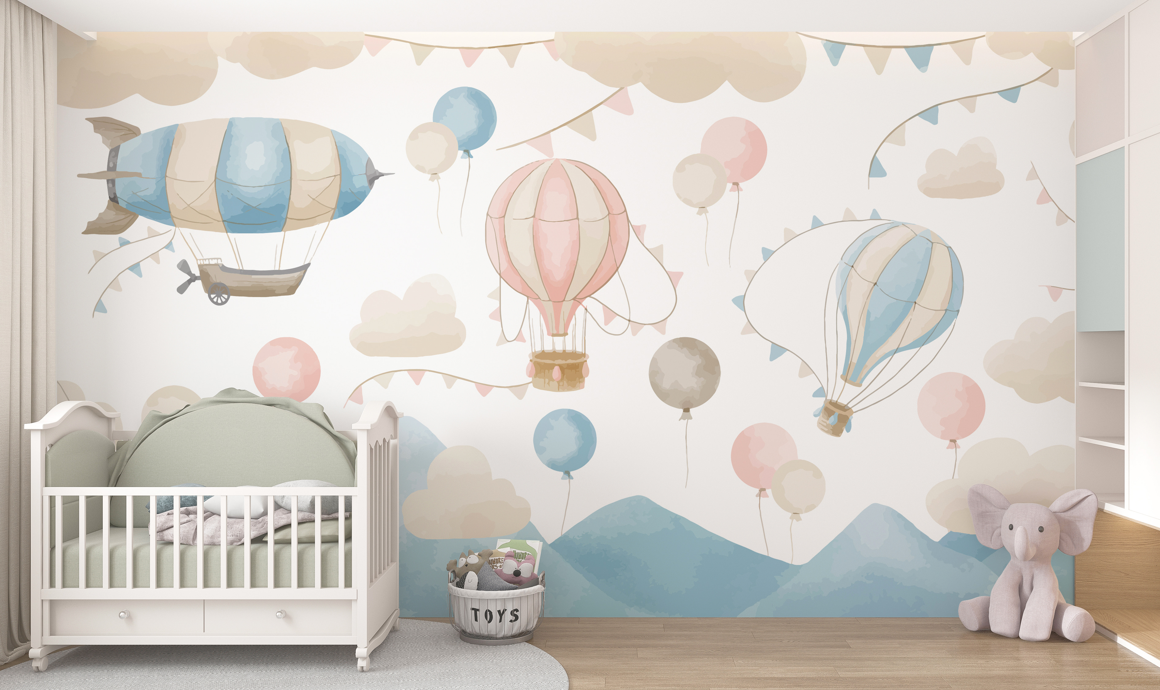 Imaginați-vă această pictură murală adorabilă, cu baloane cu aer cald roz și albe plutind senin printre nori moi și baloane în culori pastelate. Este ca și cum ai păși într-o lume de vis, capricioasă, de fiecare dată când intri în cameră. Perfectă pentru spațiul micuțului tău – mai ales dacă îi plac aventura și magia. Această pictură murală se potrivește perfect în grădinițe, camere de joacă sau în orice spațiu care are nevoie de o notă de uimire.