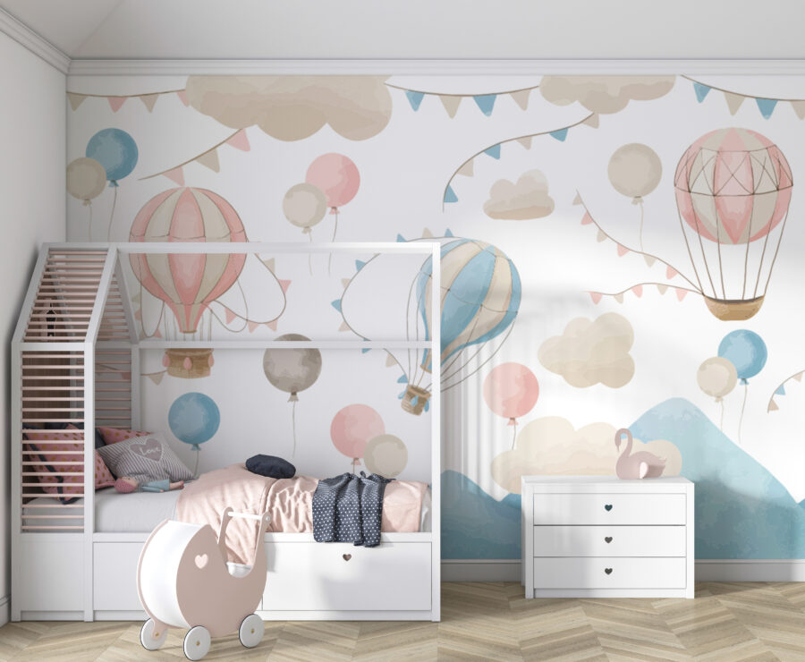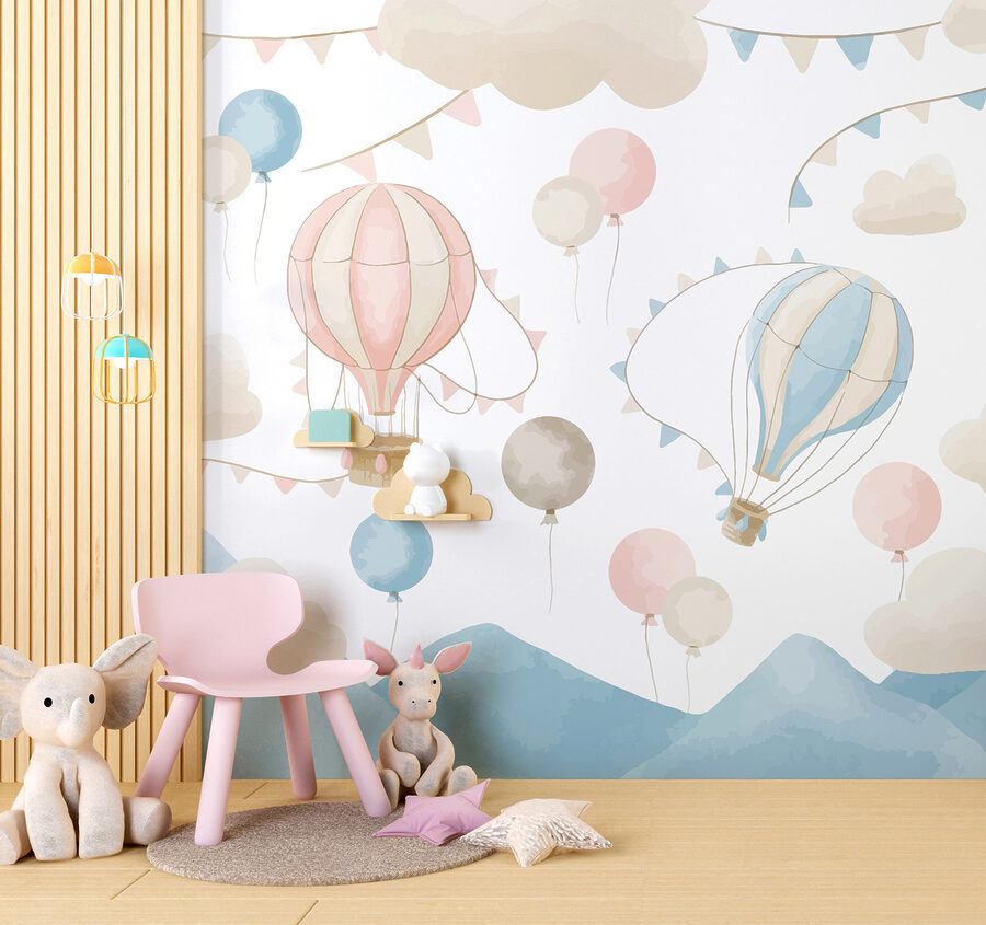 Imaginați-vă această pictură murală adorabilă, cu baloane cu aer cald roz și albe plutind senin printre nori moi și baloane în culori pastelate. Este ca și cum ai păși într-o lume de vis, capricioasă, de fiecare dată când intri în cameră. Perfectă pentru spațiul micuțului tău – mai ales dacă îi plac aventura și magia. Această pictură murală se potrivește perfect în grădinițe, camere de joacă sau în orice spațiu care are nevoie de o notă de uimire.
