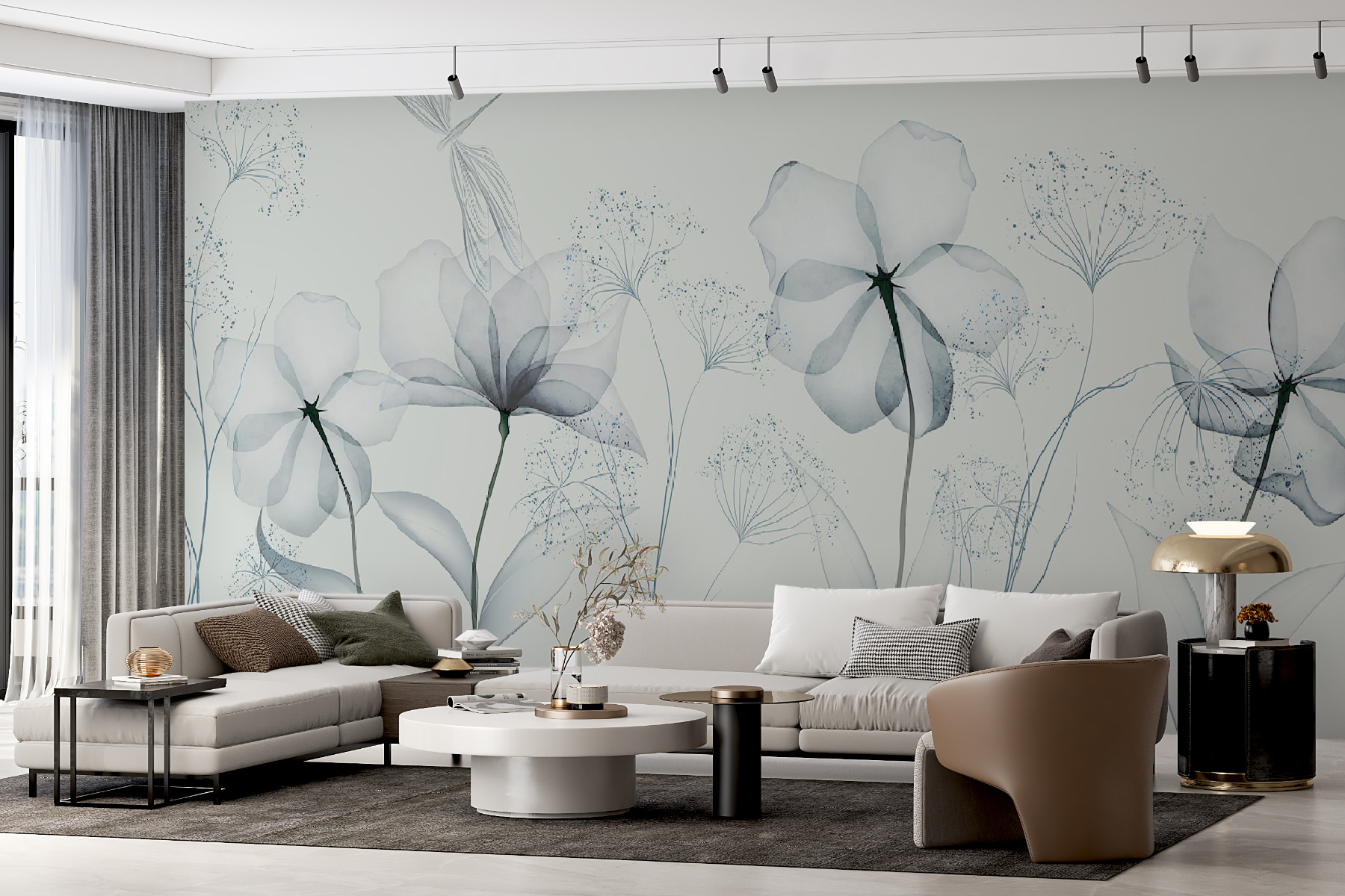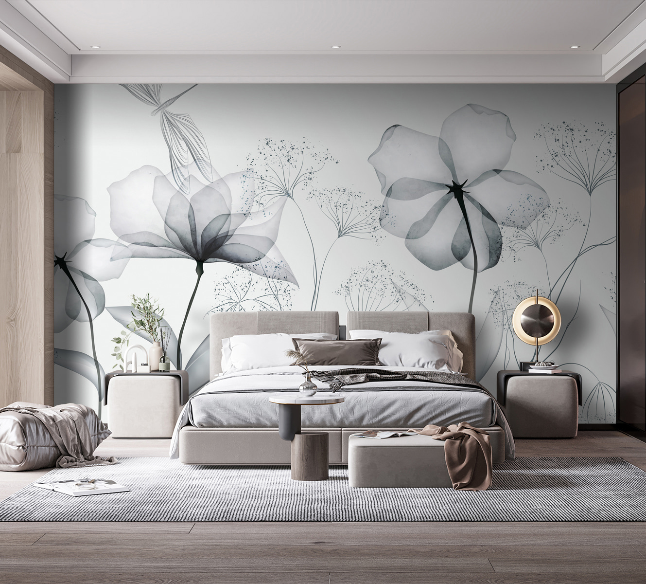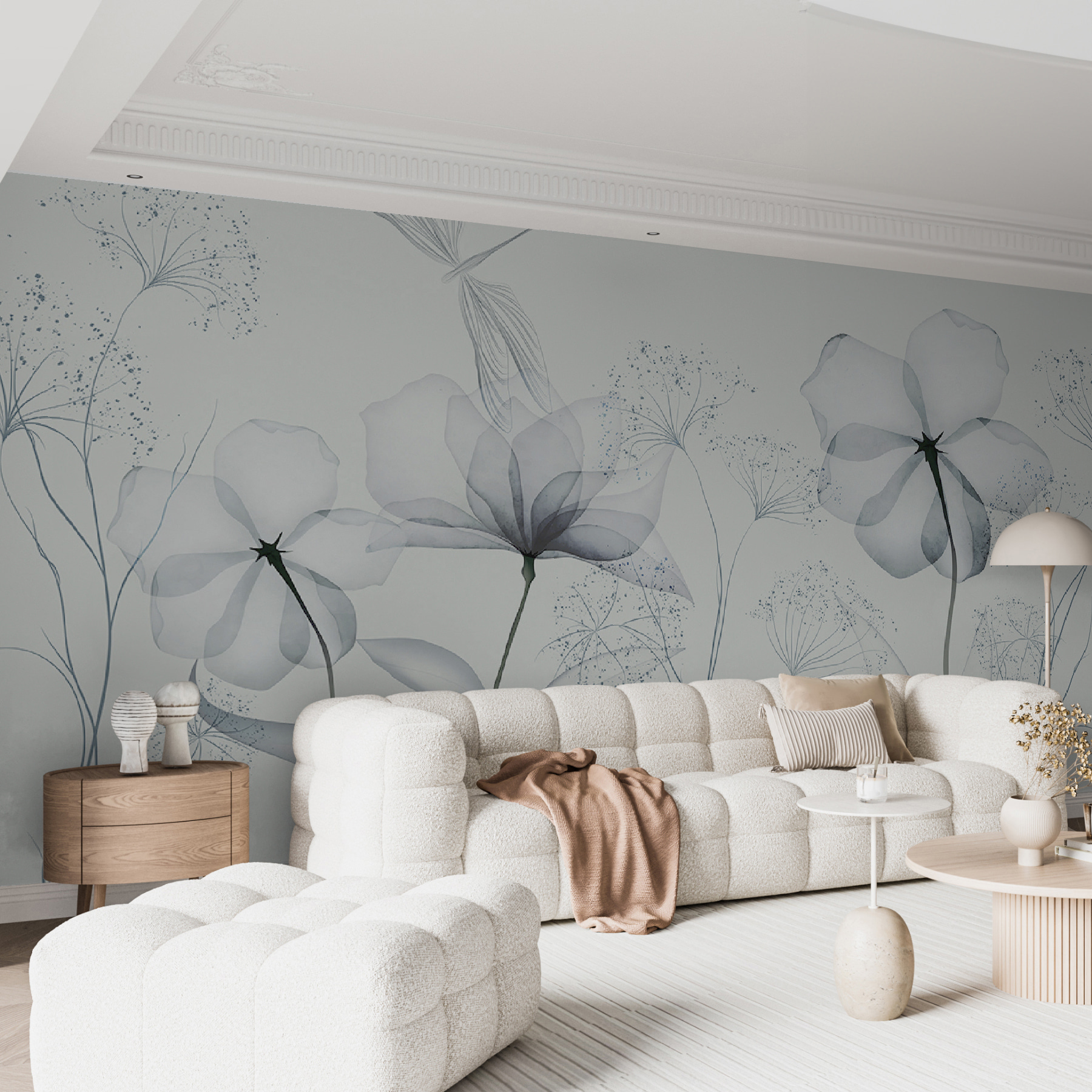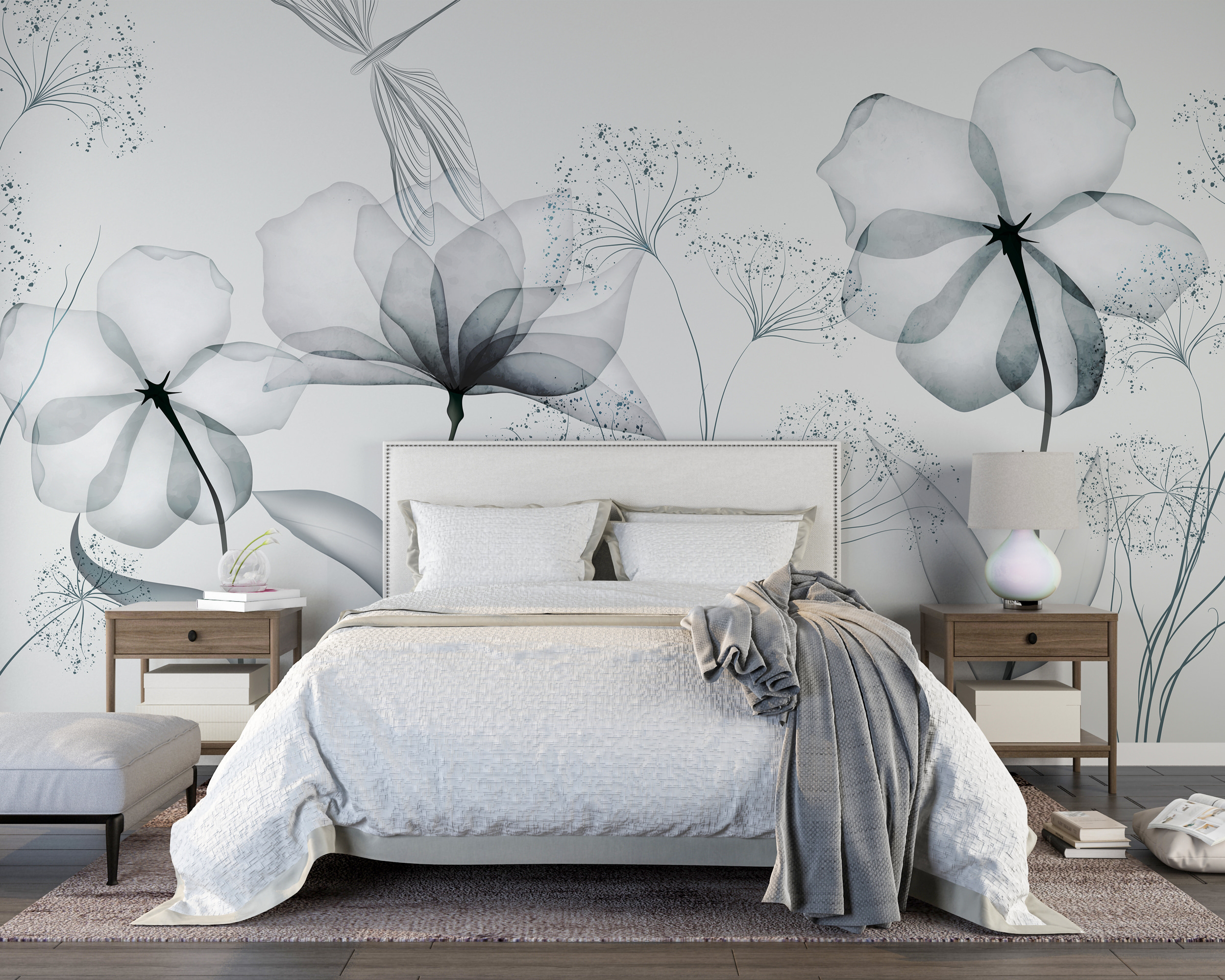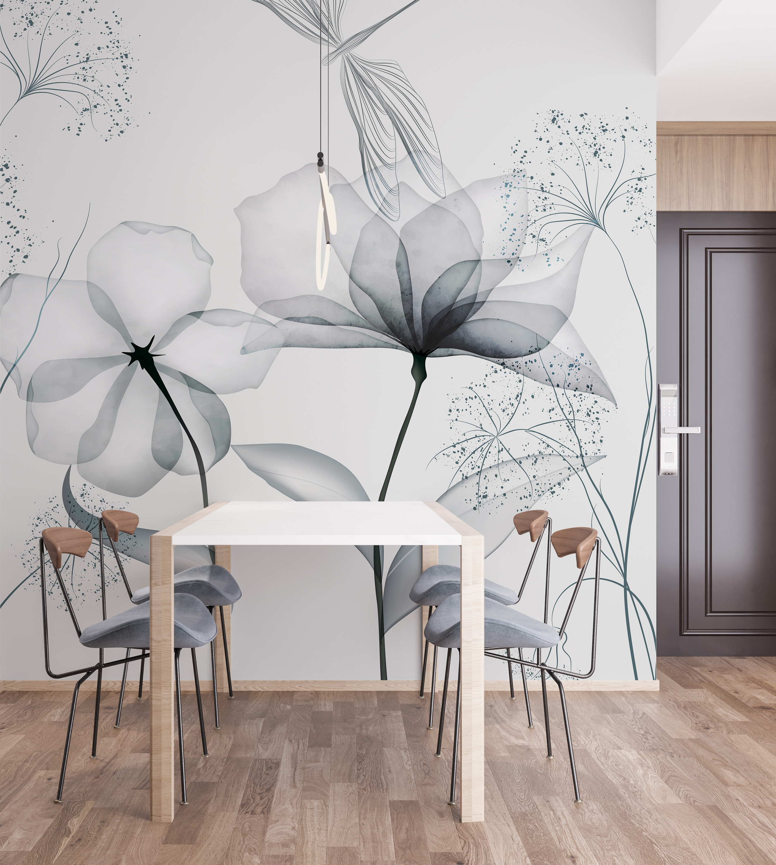 Imaginați-vă că intrați într-o cameră și sunteți întâmpinați de frumusețea simplă a florilor delicate, monocrome. Această pictură murală nu este doar decor – este o stare de spirit. Fiecare floare, ușor periat în scara de gri moale, vorbește despre dimineți calme și după-amiezi liniștite. Perfect pentru cei care iubesc o notă minimalistă, dar tânjesc după un strop de natură. Este ca și cum ai avea o grădină în acuarelă chiar în sufrageria ta, fără a fi nevoie să o uzi! Fie că visezi cu ochii deschiși în fotoliul tău preferat sau îți găzduiești prietenii, această pictură murală face ca totul să fie puțin mai senin. O mică felie de liniște pe perete. Cui nu i-ar plăcea asta?