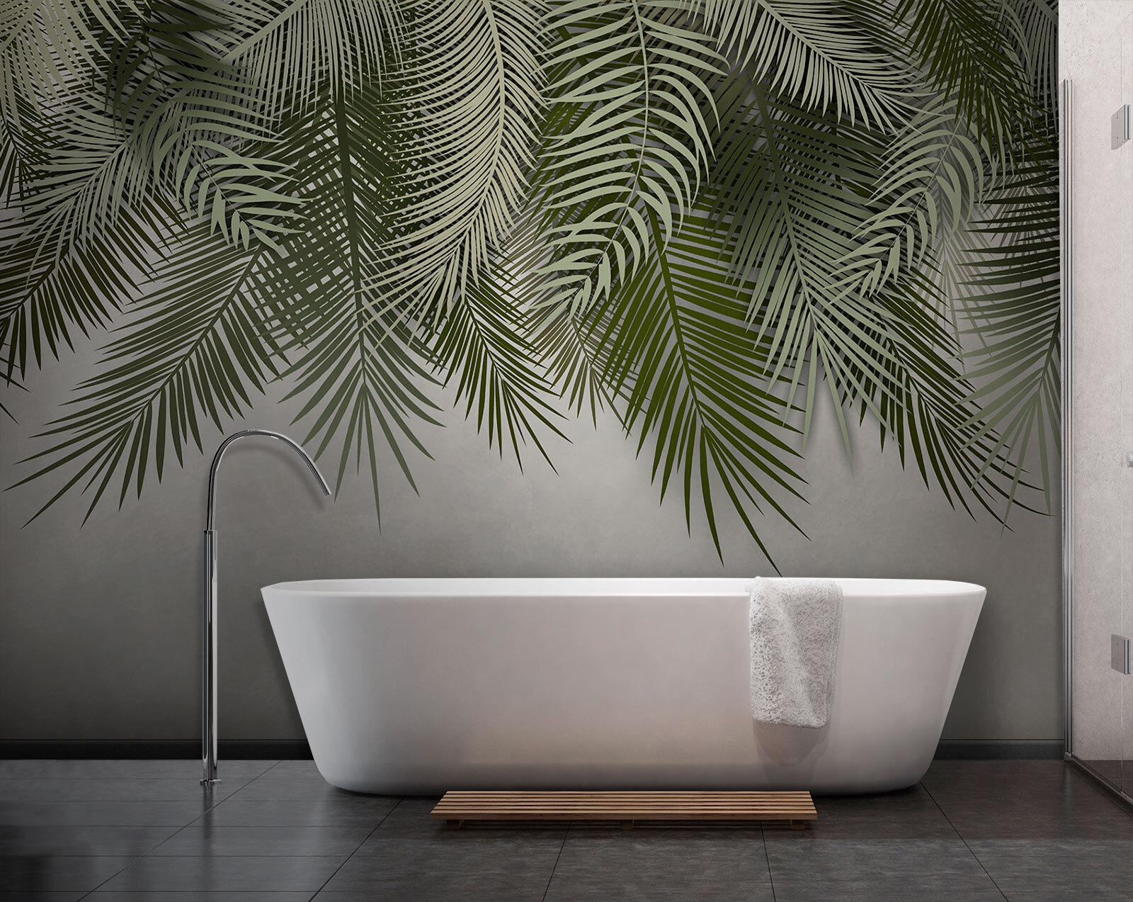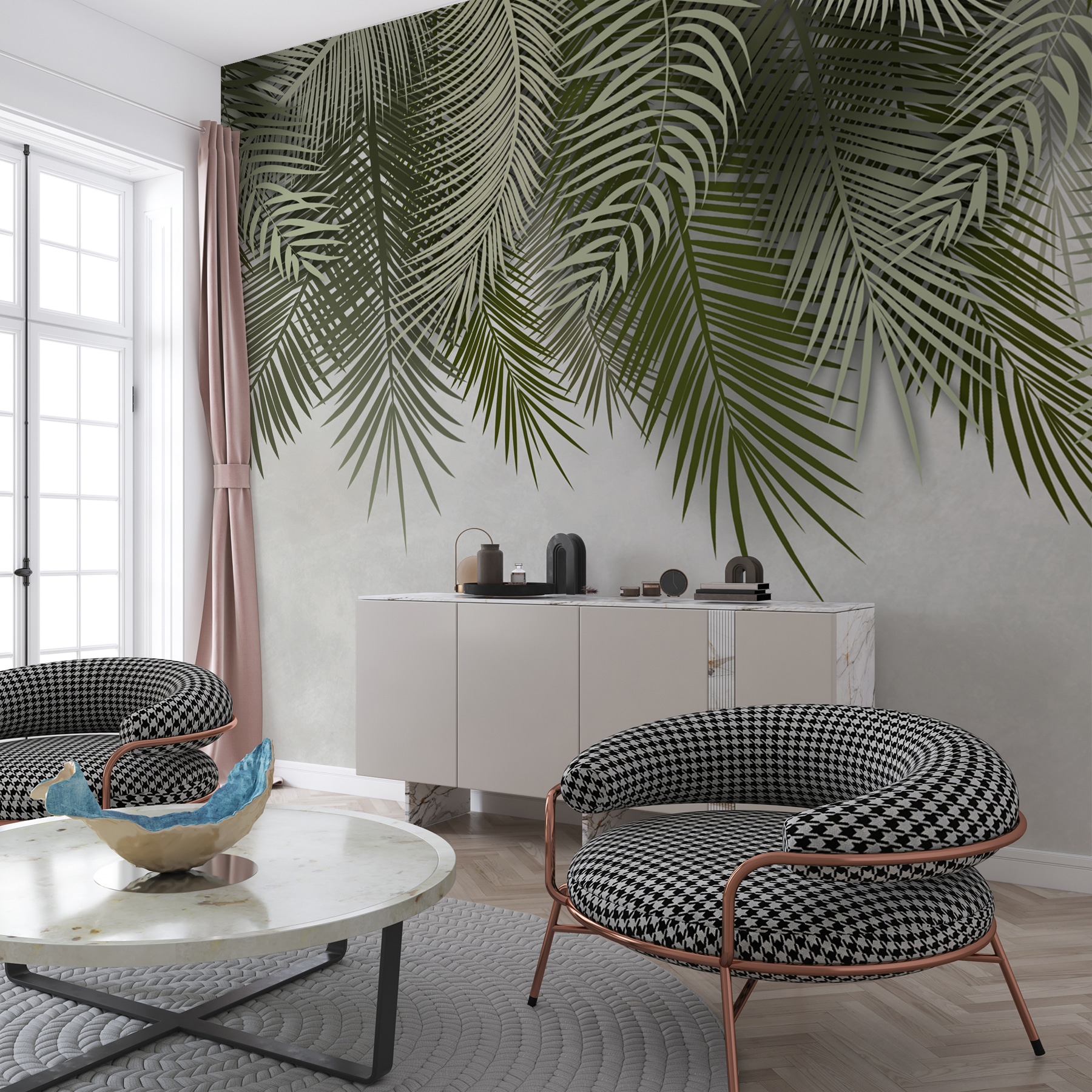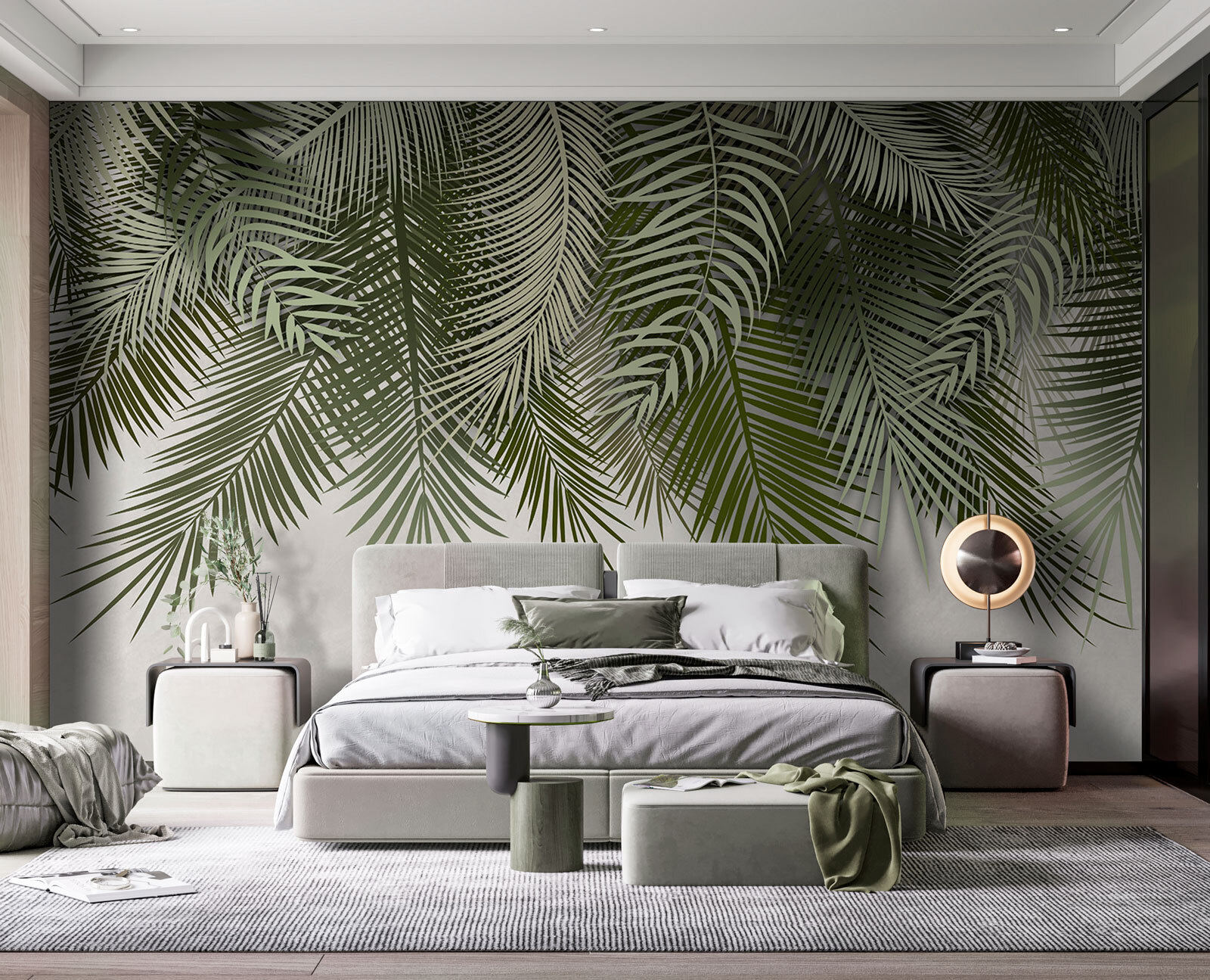 Pictura murală pare vie, dar nu copleșitoare. Este suficient pentru a vă face să vă gândiți la zile calde, cu briză, fără a trebui să vă faceți griji cu privire la udarea plantelor. Se potrivește perfect cu designul minimalist sau îl puteți completa cu un decor vibrant, cu tematică tropicală – super versatil! Acest design respiră viață și prospețime, făcându-vă să vă simțiți ca și cum v-ați afla sub un baldachin, privind cerul. Cât de cool este asta?