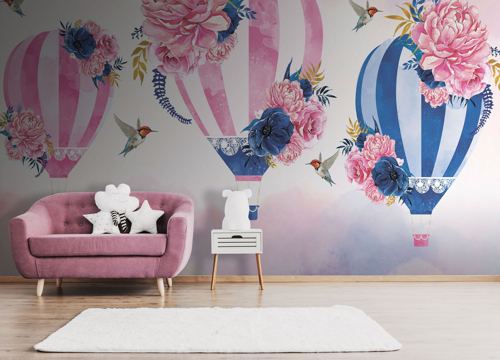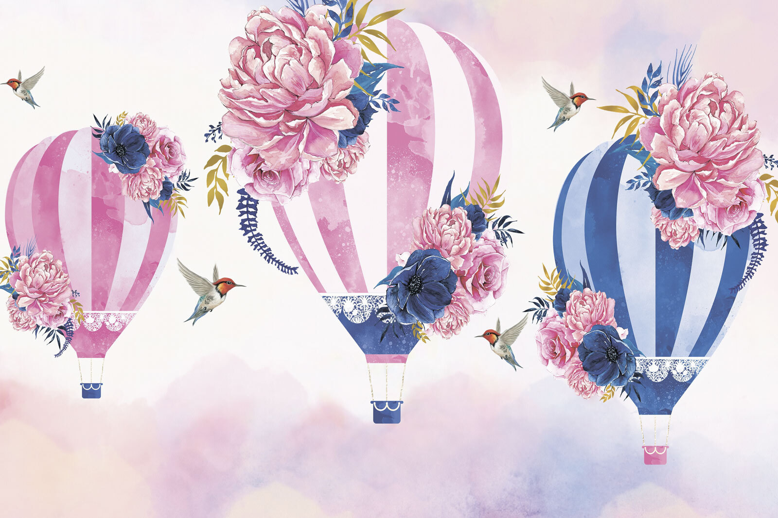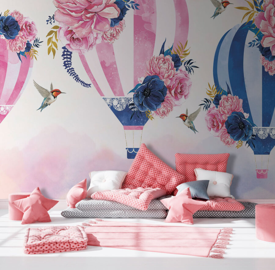 Transformați-vă spațiul cu acest mural de vis, care prezintă un grup de baloane cu aer cald împodobite cu flori frumoase. Imaginați-vă că intrați într-o cameră care pare să plutească pe o briză ușoară, unde fiecare balon aduce o notă de culoare și fantezie. Nuantele delicate și florile delicate creează o atmosferă senină, perfectă pentru un colț confortabil de lectură sau o cameră veselă pentru copii. În plus, acele mici colibri? Adorabile! Este ca și cum natura și arta ar fi purtat o conversație încântătoare, iar tu te bucuri de capodopera rezultată. Cine nu s-ar simți puțin mai ușor doar uitându-se la ea? Perfect pentru cei care cred că o fărâmă de magie poate trăi în fiecare colț al casei tale!
