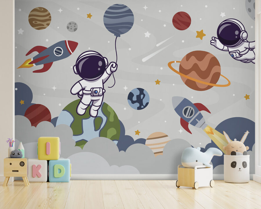 Priviți această adorabilă pictură murală “Desen animat al unei planete” – perfectă pentru a stârni bucurie și imaginație în camerele copiilor! Imaginați-vă că micii exploratori stau în pat și visează că plutesc în spațiu, înconjurați de planete capricioase, astronauți prietenoși și rachete drăguțe care trec pe lângă ei. Norii moi și stelele jucăușe adaugă căldură și liniște, făcând din ora de culcare o briză. Culorile sunt foarte vibrante, dar nu prea apăsătoare – exact ceea ce aveți nevoie pentru a crea un spațiu vesel și liniștitor. Este fantastic pentru creșe, camere de joacă sau orice loc care ar avea nevoie de o notă de aventură spațială. Nu este doar un decor, este un fundal pentru nenumărate povești și chicoteli. Micile minți curioase o vor adora!