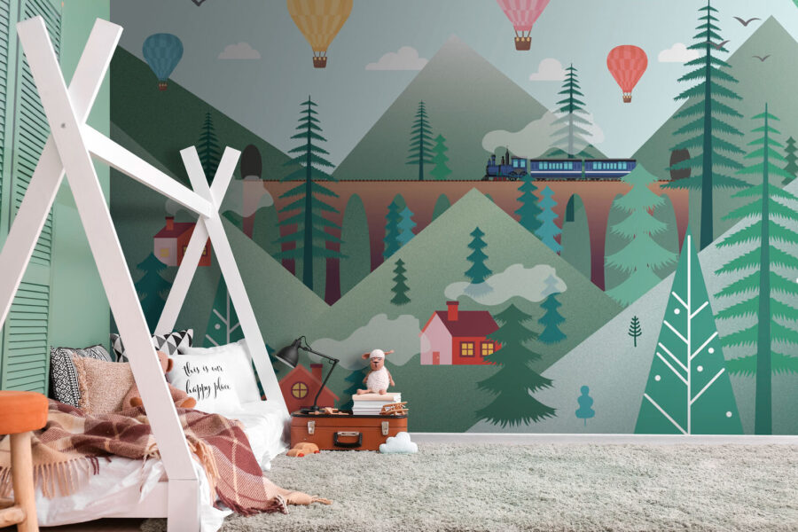 Ați visat vreodată să plutiți pe cer într-un balon cu aer cald? Ei bine, această pictură murală capricioasă “Pink Hot Air Balloon” ar putea fi cel mai bun lucru. Imaginați-vă că transformați o cameră pentru copii sau o cameră de joacă într-un paradis pastelat în care baloane colorate plutesc deasupra unor case fermecătoare și a unor munți maiestuoși. Este ca o pagină desprinsă dintr-o carte de povești – una în care fiecare privire alimentează imaginația micuțului dumneavoastră. Luminoasă, distractivă și foarte adorabilă, aduce un sentiment de calm și uimire în orice cameră. În plus, cui nu i-ar plăcea un fundal confortabil și pitoresc pentru poveștile de culcare sau aventurile din timpul jocului? Aceste mici detalii – fumul pufos de la coșuri și munții senini – adaugă un strop de magie care este atât de primitor. Nu este doar decor; este o doză zilnică de bucurie învelită într-o pictură murală.