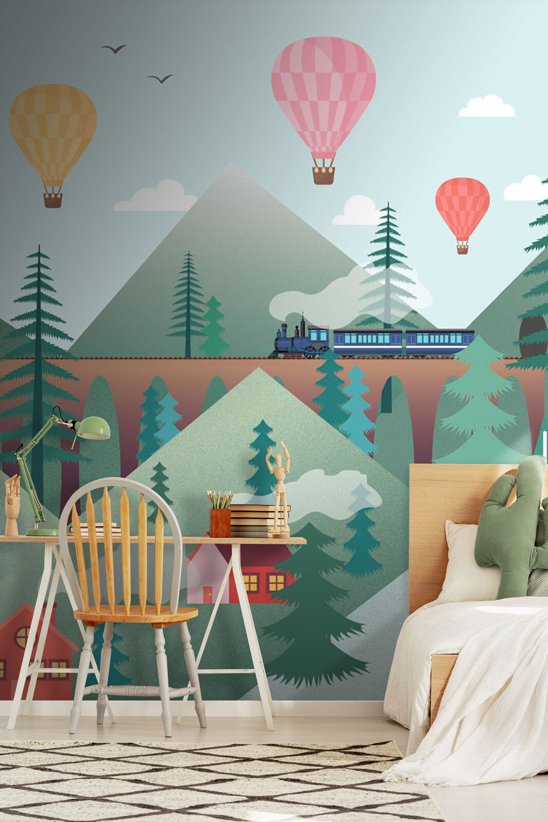 Ați visat vreodată să plutiți pe cer într-un balon cu aer cald? Ei bine, această pictură murală capricioasă “Pink Hot Air Balloon” ar putea fi cel mai bun lucru. Imaginați-vă că transformați o cameră pentru copii sau o cameră de joacă într-un paradis pastelat în care baloane colorate plutesc deasupra unor case fermecătoare și a unor munți maiestuoși. Este ca o pagină desprinsă dintr-o carte de povești – una în care fiecare privire alimentează imaginația micuțului dumneavoastră. Luminoasă, distractivă și foarte adorabilă, aduce un sentiment de calm și uimire în orice cameră. În plus, cui nu i-ar plăcea un fundal confortabil și pitoresc pentru poveștile de culcare sau aventurile din timpul jocului? Aceste mici detalii – fumul pufos de la coșuri și munții senini – adaugă un strop de magie care este atât de primitor. Nu este doar decor; este o doză zilnică de bucurie învelită într-o pictură murală.