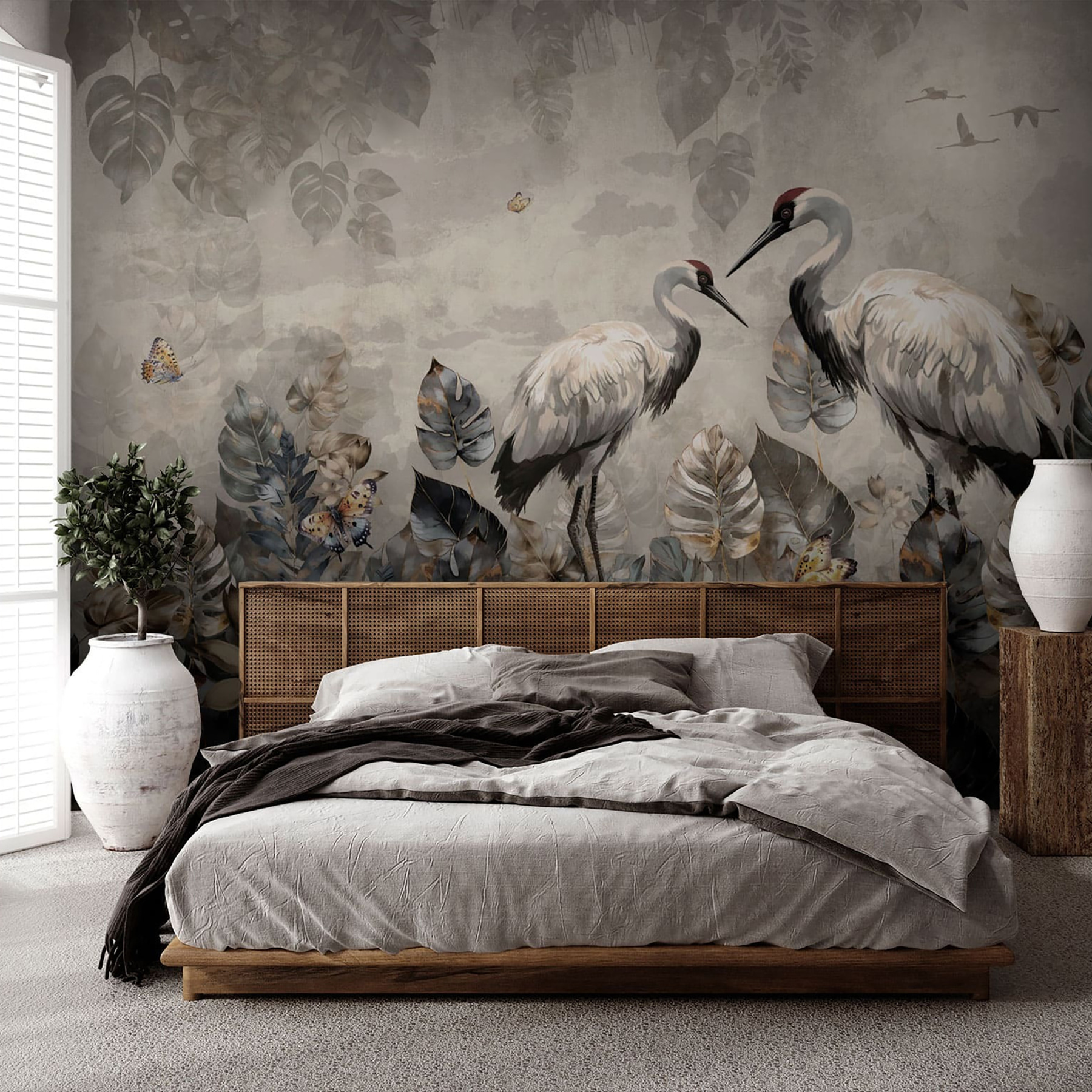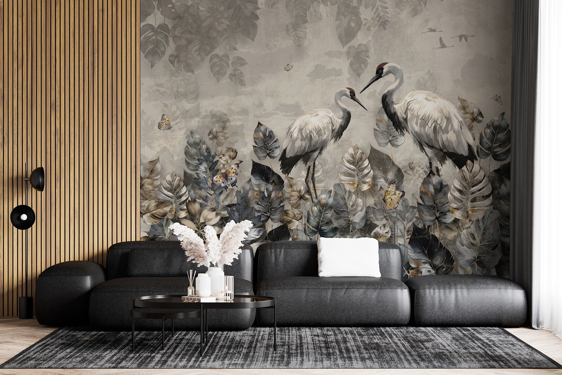 Imaginați-vă că vă treziți, vă întindeți și vă bucurați de priveliștea senină a doi cocori, dintre care unul ține un pește, chiar pe peretele dvs. Această pictură murală este mai mult decât un simplu decor; este ca și cum ai avea o felie de poezie a naturii în casă. Aceasta dansează între albastru și gri, cu fluturii fluturând în jurul frunzelor care par să fi fost sărutate de toamna târzie.