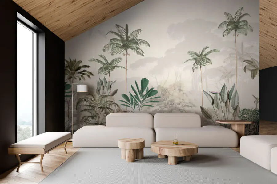 Imaginați-vă că pășiți în propriul vostru refugiu tropical de fiecare dată când intrați în cameră – exact asta aduce în spațiul dvs. această pictură murală, “Tropical Trees in Misty Forest”. Gândiți-vă la palmieri luxurianți, verzi, care se leagănă ușor în straturi de pădure moale, cețoasă în fundal. Nuanțele de verde sunt liniștitoare, dar suficient de vibrante pentru a adăuga un strop de natură. Este ca și cum ai avea o evadare eternă în pădurea tropicală chiar în casa ta. Perfect pentru iubitorii de natură cărora le lipsește doza zilnică de aer liber. Această pictură murală pare vie, aproape ca și cum ai simți ceața de dimineață pe piele și ai auzi foșnetul blând al frunzelor. Este un echilibru frumos între seninătate și înălțare, ceea ce o face ideală pentru a crea o atmosferă liniștită în camera de zi, în dormitor sau chiar într-un colț de lectură confortabil. În plus, este un starter de conversație fabulos pentru oaspeți – cine nu ar vrea să se piardă în această pădure de vis?