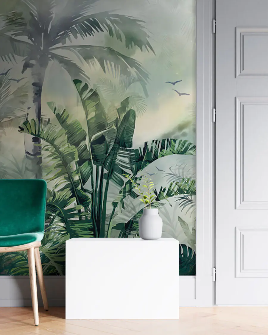 Transformați orice cameră într-un paradis luxuriant cu această pictură murală uimitoare a unei jungle cețoase. Imaginați-vă că vă plimbați prin frunzișul dens, respirând aer curat – ah, seninătatea! Este ca și cum ai avea o mini-vacanță chiar la tine acasă, dar fără stresul călătoriei. Verdele blând și pâlpâirile blânde de ceață invită la vibrații calme, perfecte pentru un colț de lectură confortabil sau o escapadă senină în dormitor. În plus, cine nu și-ar dori să se simtă ca și cum ar sorbi o băutură într-o escapadă tropicală în fiecare zi? Pregătiți-vă să îmbrățișați aventura sălbatică, totul din confortul canapelei dvs.