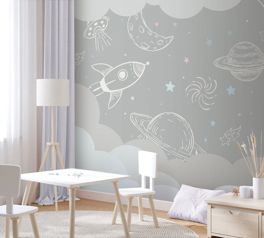 Aruncați o privire la această pictură murală fermecătoare, “White Star on a Grey Background!” Este ca o călătorie de vis prin spațiu chiar în camera ta. Perfect pentru copii, în special pentru cei care nu se pot opri să vorbească despre rachete și astronauți. Imaginează-ți-i pe cei mici învelindu-se noaptea, simțindu-se ca printre stele. Are acea vibrație desenată de mână cu nave spațiale, planete și stele – ca niște mâzgălituri dintr-un jurnal cosmic.