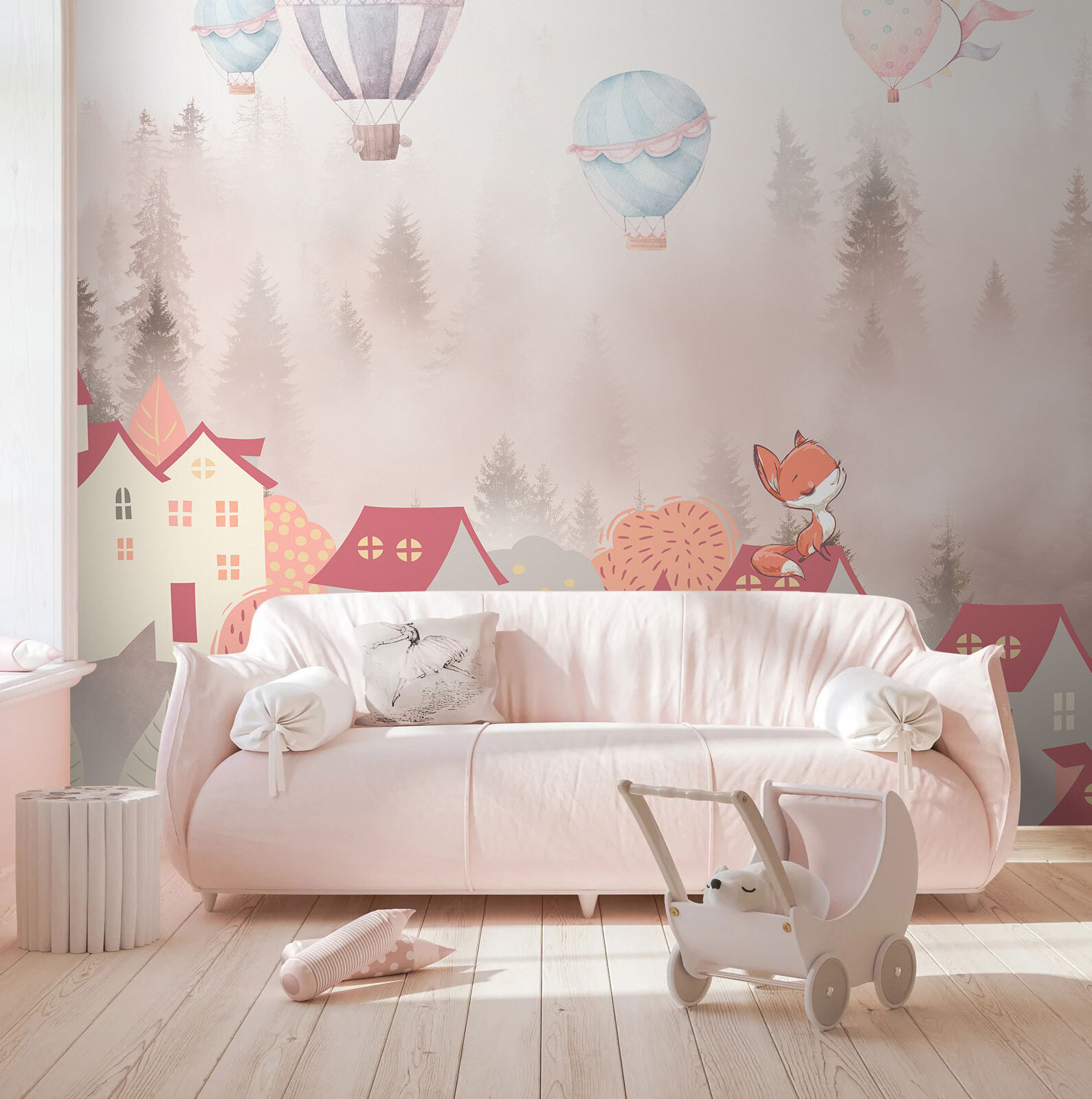 Transform your space with this whimsical wall mural featuring a charming fox perched atop colorful rooftops. Just imagine the serenity it brings, like a cozy fairytale in your own home! Hot air balloons float lazily in the sky, adding a playful touch and inviting daydreams of adventure. Perfect for a child’s room or a cozy reading nook, it’s a delightful reminder to embrace imagination in everyday life. The soft hues create an inviting atmosphere—who could resist a mural that sparks joy every time you walk by? It’s like having a little bit of magic right on your wall!