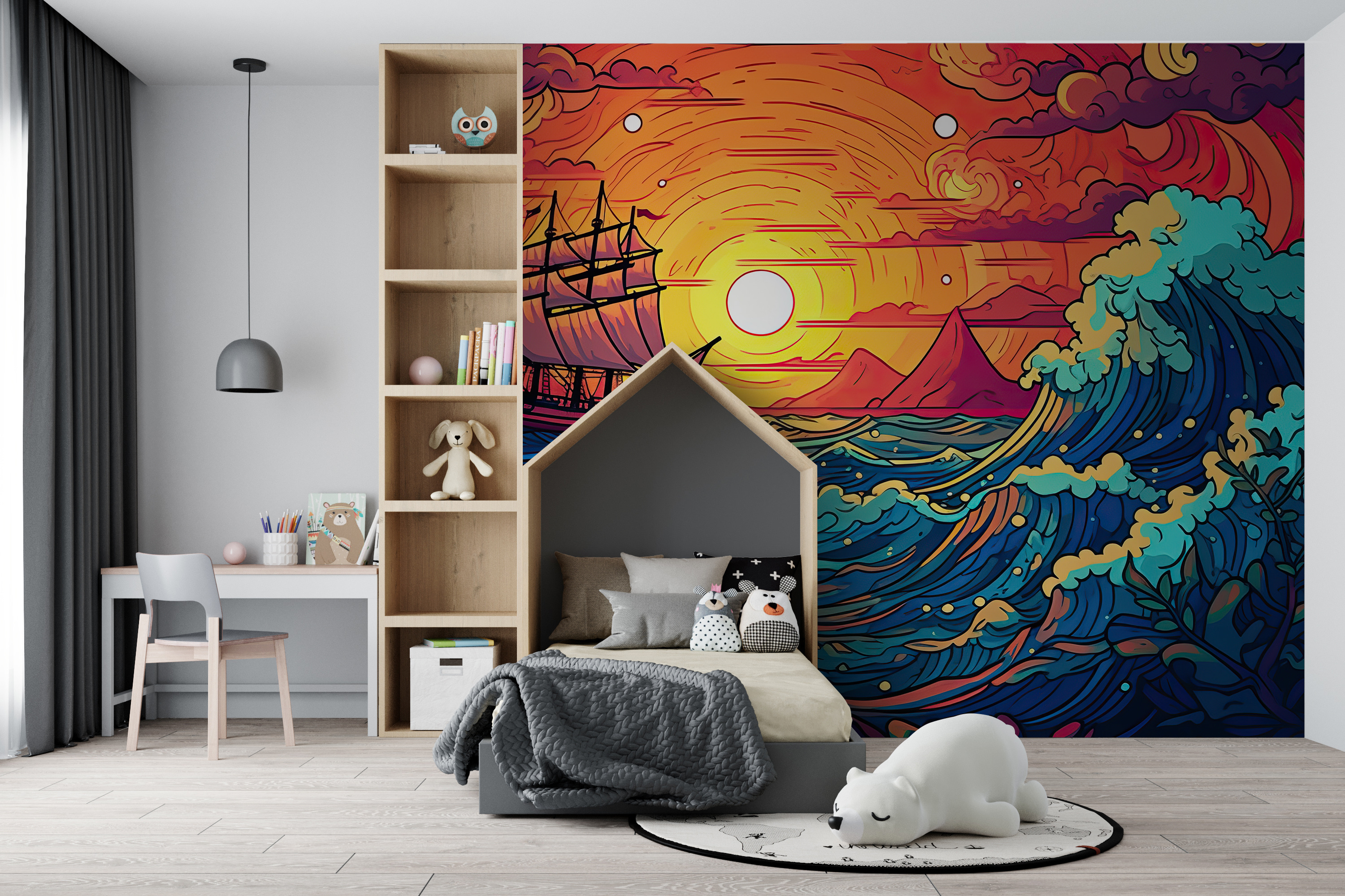 Imaginați-vă soarele apunând peste valuri cu o corabie maiestuoasă navigând prin zonă. Micuțul dvs. ar putea visa la aventuri ale piraților sau pur și simplu să se bucure de scena liniștitoare de pe malul mării. Totuși, nu este doar pentru copii – această pictură murală se potrivește perfect într-o cameră cu tematică marină sau în orice spațiu care are nevoie de o explozie de frumusețe a naturii.