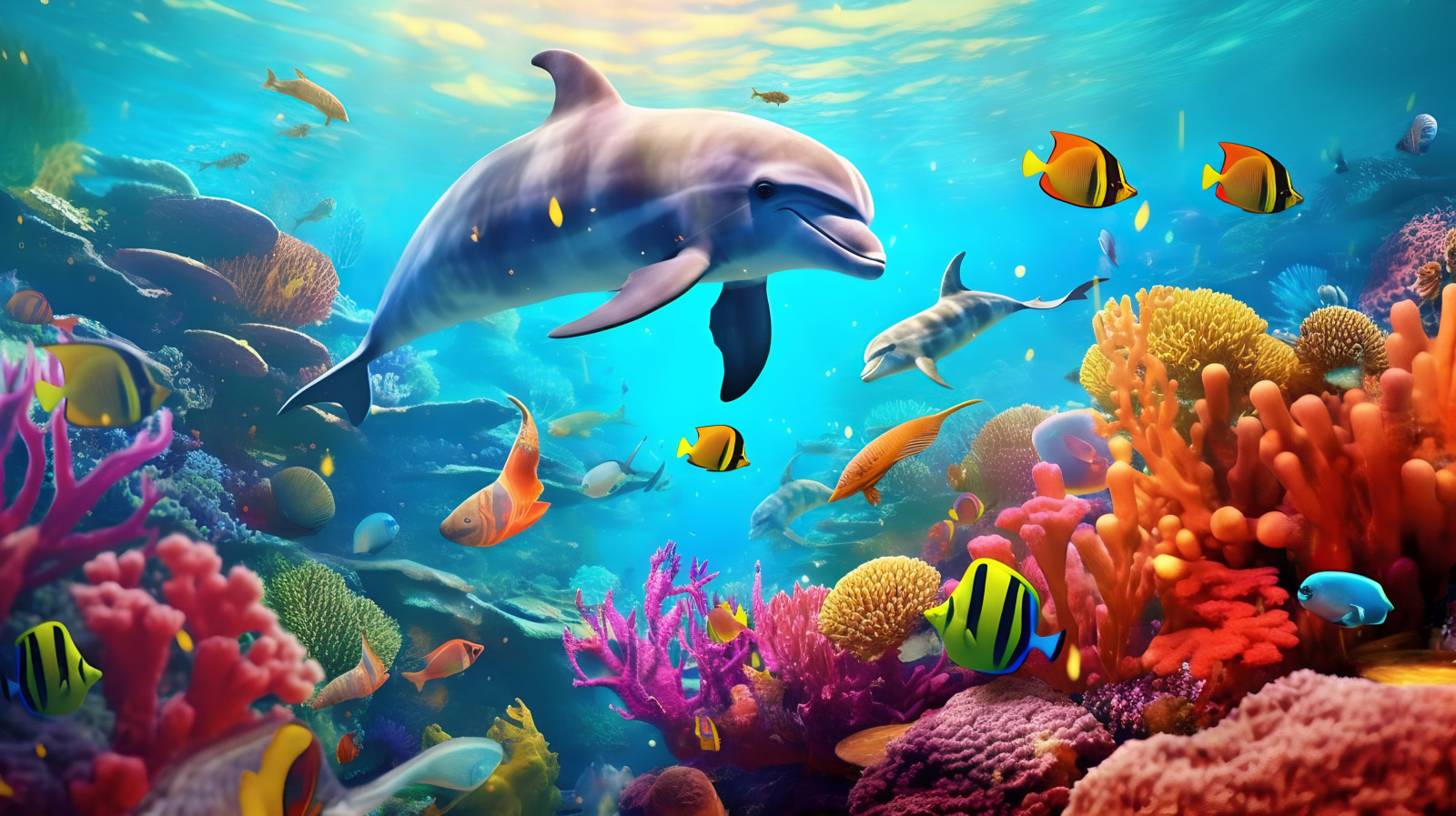 Scufundați-vă într-o lume a culorilor și a bucuriei cu această pictură murală captivantă cu delfini alunecând printr-un recif de corali vibrant. Perfectă pentru a înveseli camera unui copil sau pentru a adăuga un strop de distracție oricărui spațiu, aceasta aduce minunea oceanului direct pe pereții dvs. Imaginați-vă-i pe cei mici zâmbind în timp ce explorează scena subacvatică, plină de pești prietenoși și delfini jucăuși. Fiecare privire se simte ca o mini-vacanță! Nuanțele vor dansa în lumină, creând o atmosferă plină de viață care stârnește imaginația și aventura. Cine nu și-ar dori să înoate cu delfinii în visele sale?