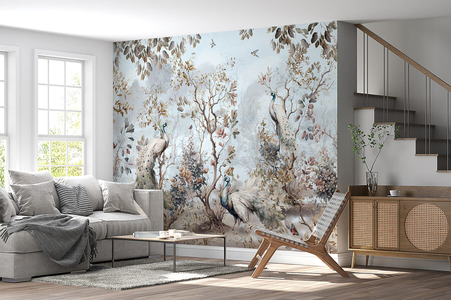 Căutați să aduceți o notă de fantezie a naturii în interior? Pictura murală “Pasăre zburând pe cer” ar putea fi exact ceea ce spațiul dvs. are nevoie. Imaginați-vă că vă treziți la această scenă de vis cu păuni eleganți care se plimbă în jurul copacilor frumos pictați. Nuanțele blânde și detaliile complicate fac să simțiți îmbrățișarea calmă a naturii chiar în camera dvs. de zi sau în dormitor.