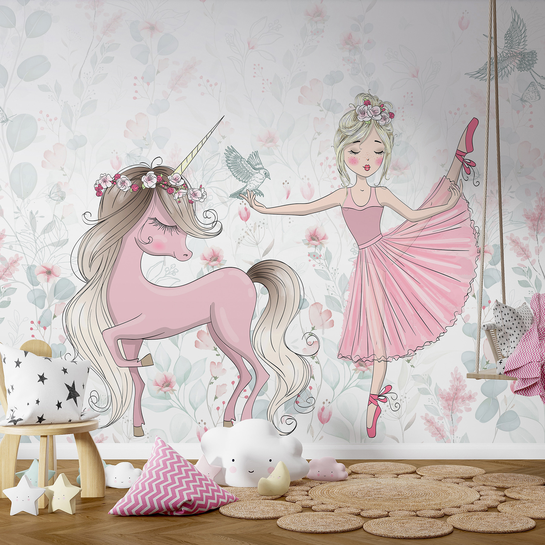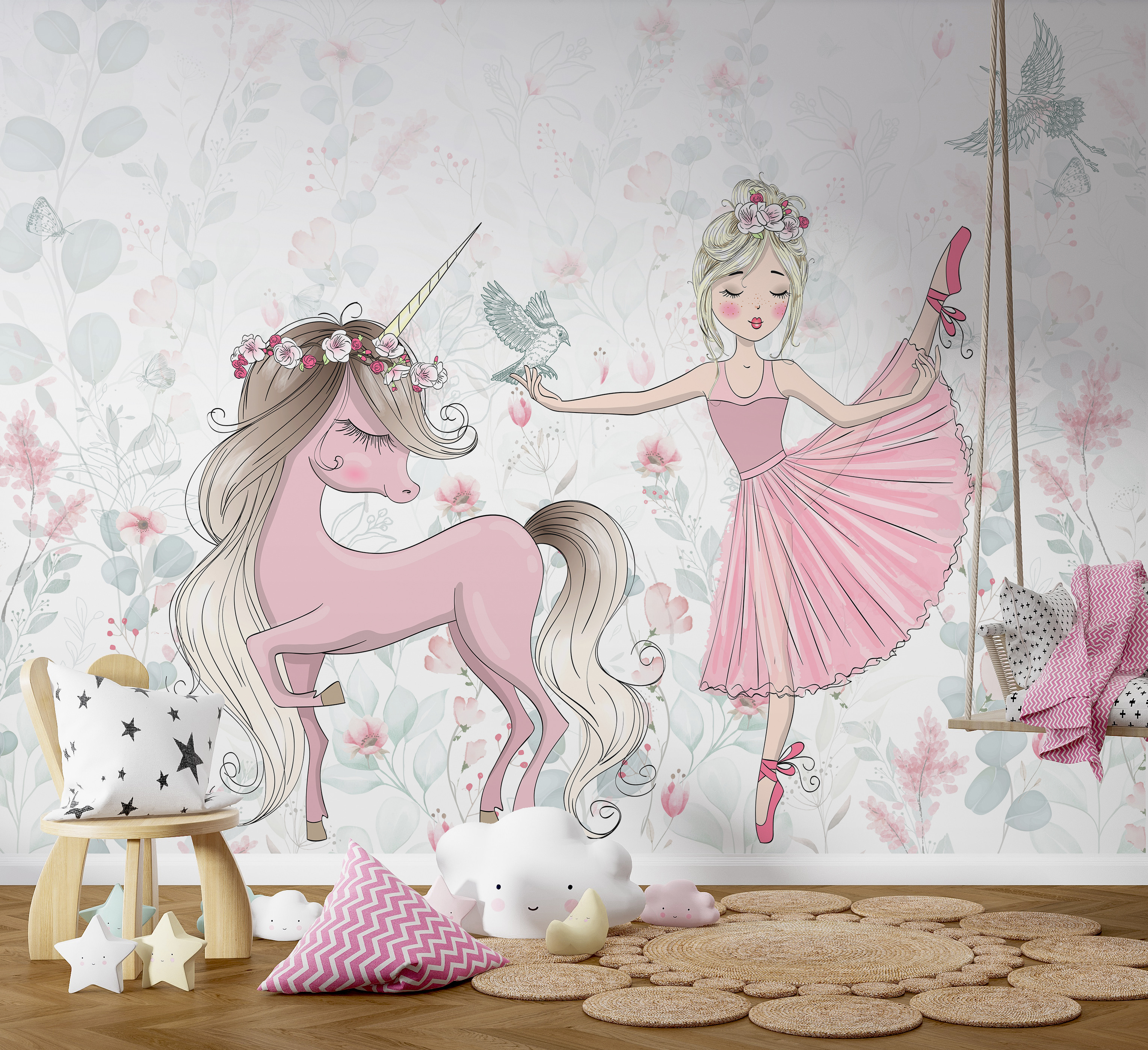 Ați visat vreodată să dansați cu un unicorn? Această pictură murală “Balerina și unicornul” aduce la viață această fantezie magică. Ideal pentru camera unui copil, în special pentru micile balerine și entuziaști ai unicornului! Imaginați-vă că fiica dvs. se trezește în fiecare dimineață cu acest lucru, o încântare pură. Florile pastelate moi și detaliile delicate îl transformă într-un fundal fermecător – perfect pentru ora de povești sau de joacă. Este ca și cum ai păși într-un basm; culorile blânde și desenele capricioase creează un spațiu liniștitor și imaginativ. Se simte ca un moment desprins direct dintr-o carte de povești. Nu este doar o pictură murală – este un strop de magie pentru orice cameră. Sincer, nu puteți să auziți chicotelile și să vedeți rotițele?